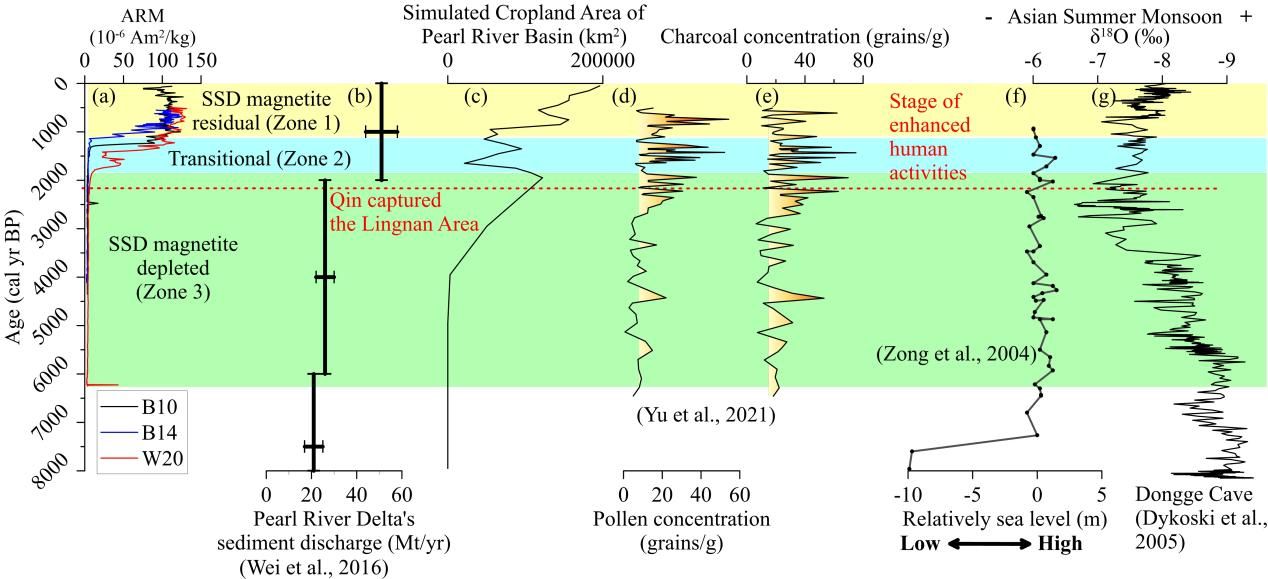 图3 磁性矿物溶解剖面变化与珠江三角洲充填、人类活动、海平面、夏季风等环境演变对比