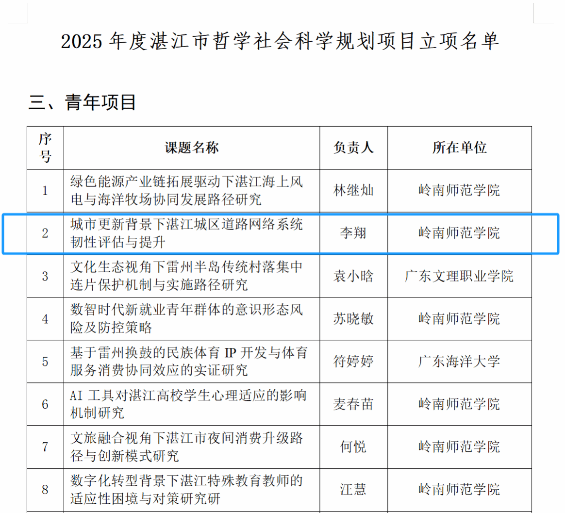 根据《关于2025年度湛江市哲学社会科学规划项目立项名单的公示》,在2025年度湛江市哲学社会科学规划项目立项名单的青年项目中,我院李翔老师的《城市更新背景下湛江城区道路网络系统韧性评估与提升》获得立项!