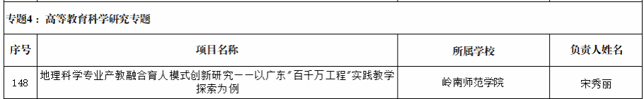 近日,在2025年广东省教育科学规划课题(高等教育专项)中,我院宋秀丽副教授申报的《地理科学专业产教融合育人模式创新研究——以广东“百千万工程”实践教学探索为例》课题成功立项。此次立项,是我院在深化产教融合、驱动育人模式创新的又一重要实践。