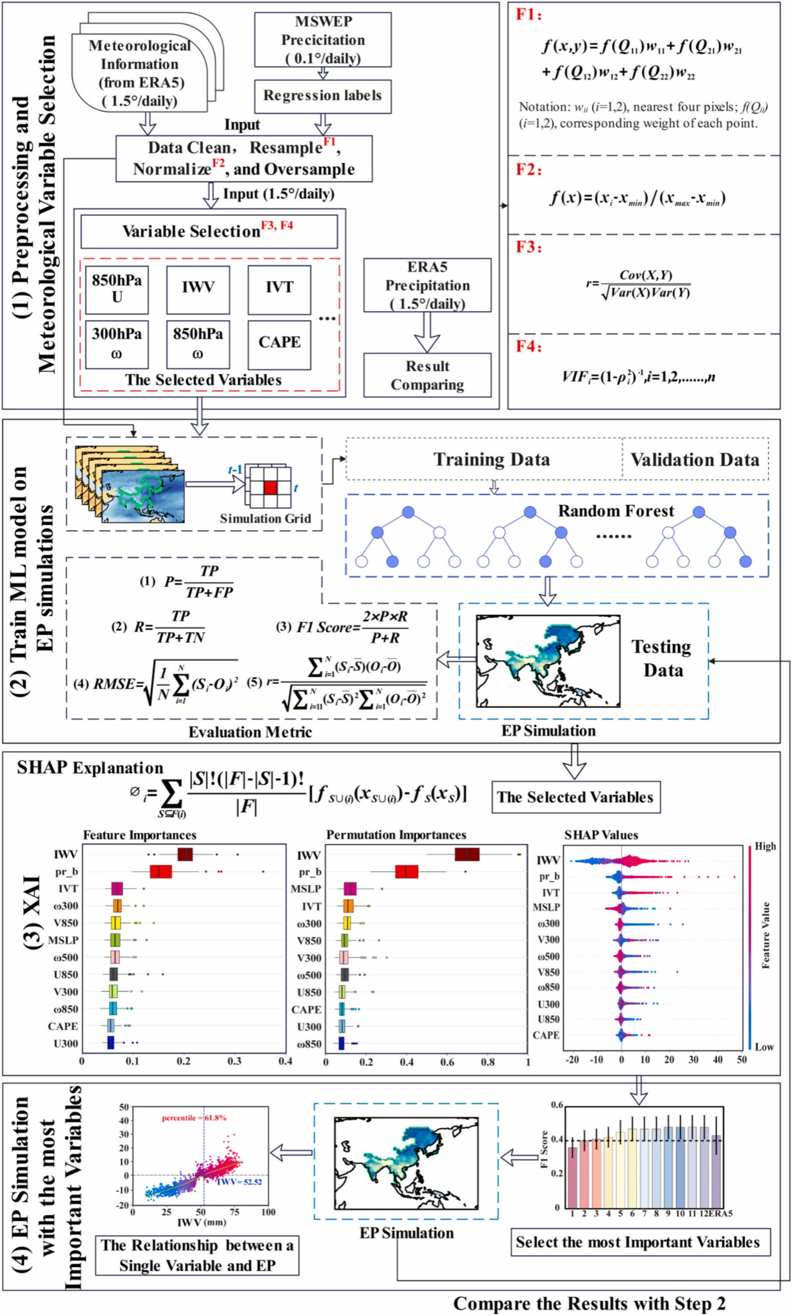 文章简介:亚洲季风区作为全球气候系统的重要组成部分,每年夏季遭受频繁的极端降水事件,严重威胁人类生命财产安全和自然生态系统。然而,由于该区域地形复杂、大气环流多变,传统气候模型在模拟极端降水时存在显著偏差,难以准确揭示其形成机理。特别是各气象变量间的相互作用及其对极端降水的综合影响,一直是科学界研究的难点。针对上述挑战,研究团队开发了名为XEP-Sim的可解释极端降水模拟框架,该框架集成了随机森林、SHAP等机器学习算法,能够定量评估各气象变量对极端降水的独立及协同作用(图1)。研究团队发现:整层水汽是驱动极端降水的首要因素,该变量在极端条件下的极端降水强度可较平时提高近2.8倍。此外,前一天降水、水汽通量、海表面气压、300hPa垂直风速及850hPa经向风等五个变量亦对极端降水有显著影响。另一方面,极端降水往往发生在多个气象变量同时达到极端状态时。特别是整层水汽与其他变量的极端组合,能够显著放大降水强度,揭示了多变量协同作用对极端降水的重要贡献(图2)。通过SHAP值依赖图和敏感性实验,研究进一步揭示了关键变量影响极端降水的物理路径。例如,极端整层水汽通过增强大气湿度和潜热释放,促进强烈的垂直上升运动,进而加剧降水;而海表面气压的降低和300hPa垂直风速的负异常则通过动力作用触发或加强垂直运动,共同影响极端降水的发生和发展(图3)。本研究不仅深化了对亚洲季风区极端降水形成机制的科学认识,还为气候模型的改进和极端降水预测提供了新思路。通过明确关键气象变量及其相互作用,研究团队为数据驱动的气候模型变量选择提供了科学依据,有助于提升模型对极端降水事件的模拟和预测能力。此外,可解释人工智能技术的应用使得模型解释性显著增强,为气候变化适应和防灾减灾提供了有力支持。