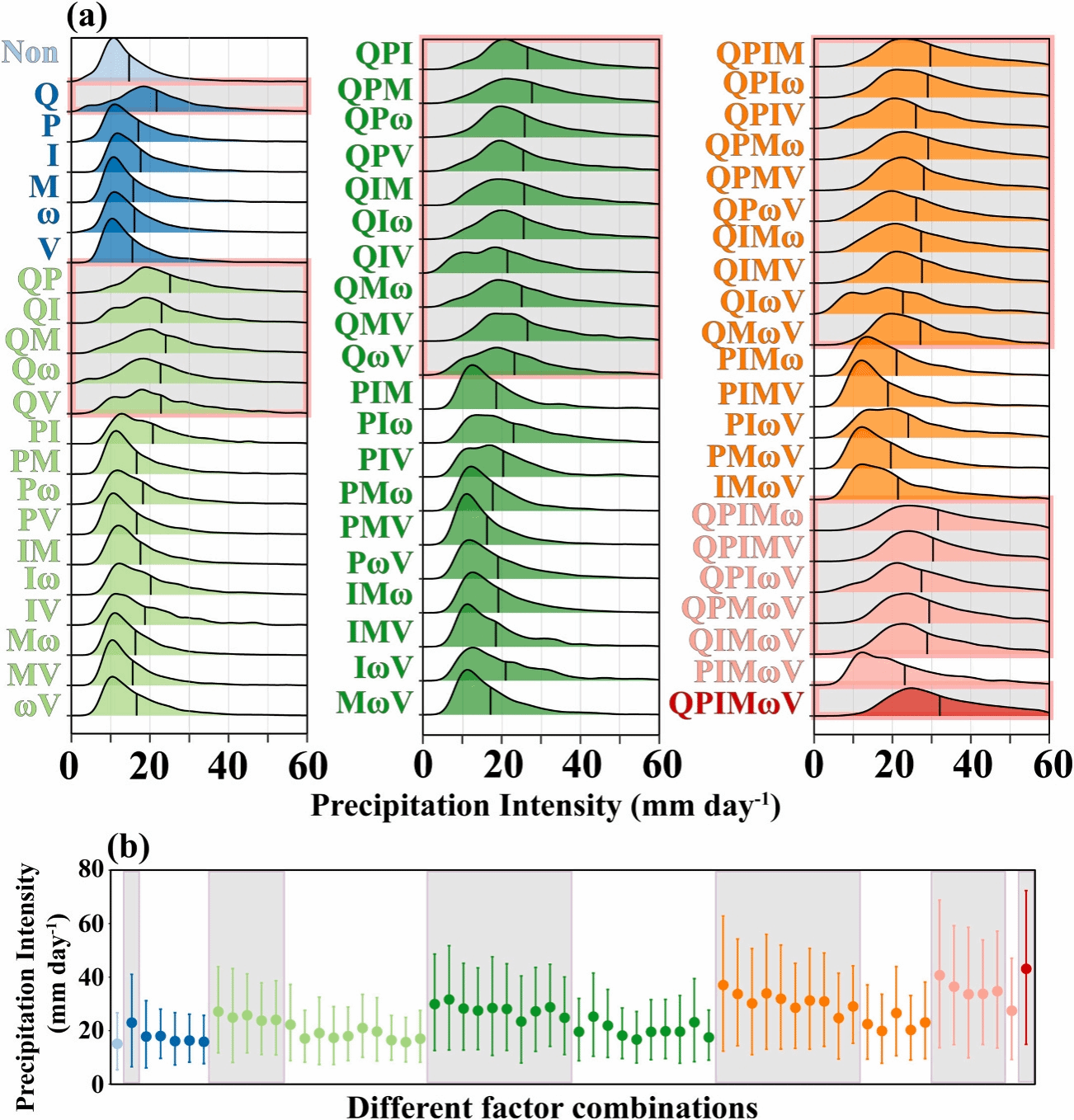 图2. 当六个关键输入变量的不同组合处于极端情况时,极端降水的强度变化