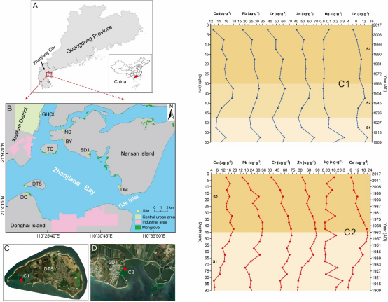 文章简介:红树林是生长在热带和亚热带潮间带的木本植物群落,具有重要的经济、社会和生态服务价值,有着“海岸卫士”之称。红树林在应对全球气候变化和保护生物多样性方面具有巨大潜力。然而,由于受到各种污染物的威胁,红树林的生态服务功能正在逐渐下降,尤其是重金属污染问题备受关注。因此,研究红树林沉积物的重金属污染现状和沉积历史对如何保护红树林尤其重要。本研究以广东省湛江湾红树林保护区为研究案例,分析红树林沉积物中重金属的污染现状、沉积过程及其影响因素。主要发现:1)首次获取湛江湾红树林沉积岩芯重金属分布数据,揭示了重金属含量最高值出现在岩芯的较深处,而非红树林表层沉积物中。1954年来红树林沉积物中重金属含量逐渐下降而非升高。2)红树林沉积物中Cu、Zn和Hg可能主要来自人为源,Co可能来自自然源,Pb和Cr来源较复杂,包括了自然和人为来源。3)湛江湾红树林沉积物中重金属沉积过程受到自然因素和人类活动的影响。填海造陆、砍伐红树林、降水、风暴潮、海平面上升、涨潮等,可能会导致红树林沉积物中重金属含量逐渐下降。需要考虑自然因素在红树林沉积物的重金属沉积过程的重要性,尤其是全球气候变化大背景下。另外,为了得出合理的污染评价结果,需要对比沉积岩芯和表层沉积物的重金属数据。