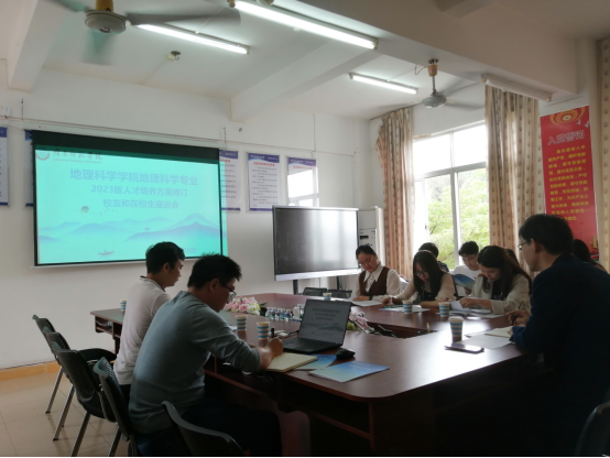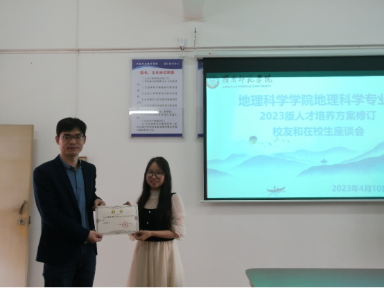 为推进2023版人才培养方案修订,促进我院教育质量、教学效果提升,4月10日下午,地理科学学院在第二教学楼310会议室举行教学研讨会暨校友导师聘任仪式。参加会议的有学院副院长尚志海、学院专业教师、优秀校友黄慈庆、詹梅鑫、李丽苹、麦昌福、周敏等。