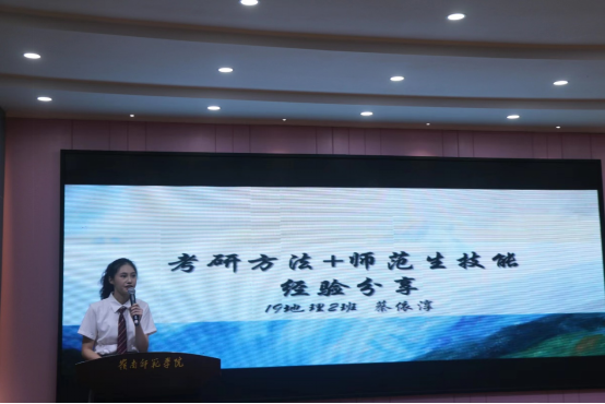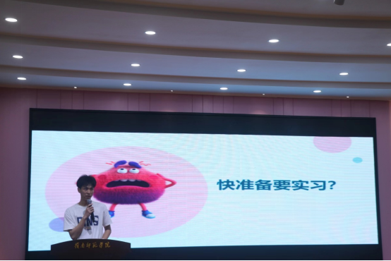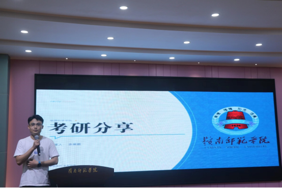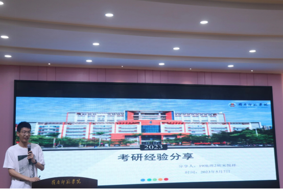 颁奖结束后,三位考研标兵代表蔡依淳、余展鹏、宋悦祥依次上台发言。他们围绕择校考虑因素、学习经验分享、考研心得体会等方面进行经验交流。