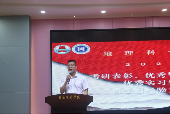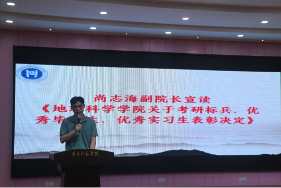 观看视频后,尚志海宣读《地理科学学院关于表彰考研标兵、优秀毕业生、优秀实习生的决定》。