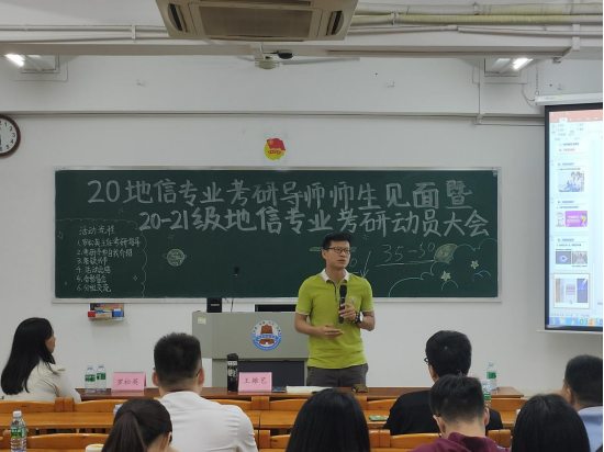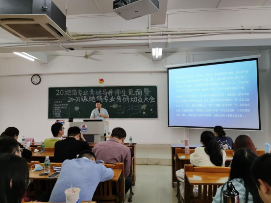 11月9日下午,地理科学学院于第三教学楼905教室召开2020级地理信息科学专业考研导师师生见面暨2020级、2021级地理信息科学专业考研动员大会。学院党委副书记王雄艺、学工办副主任陈水英、地理信息科学系主任罗松英博士、副主任杨俊杰博士、2018级毕业生曾祺盛(广州大学在读研究生),2020级地理信息科学专业全体考研指导教师以及2020级、2021级地信专业全体学生出席和参加会议。