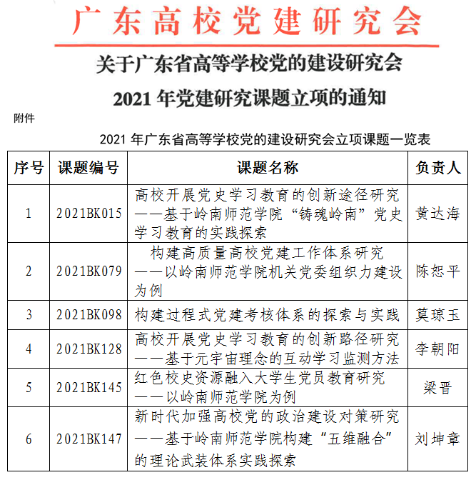 近日,广东省高校党建研究会下发《关于公布广东省高等学校党的建设研究会2021年党建研究课题立项的通知》,我校喜获6个课题立项。