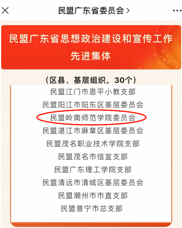我校民盟基层委在民盟湛江市委、学校党委的正确领导下,坚持以习近平新时代中国特色社会主义思想为指导,旗帜鲜明讲政治,在组织建设、履职尽责、助力发展、服务大局方面取得显著成效。一是组织建设稳步向前,为湛江统战专家智库建设添砖加瓦,一位盟员入选“全球前2%顶尖科学家排名”榜单,5位盟员获得民盟市委优秀盟员;二是履职尽责双岗建功,积极开展调查研究、理论宣讲、技术帮扶,充分发挥专业优势,与湛江红树林管理局、湛江南药试验场等开展产研合作,助力湛江高质量发展。三是参政议政成绩显著,盟员向市政协、市委会提交提案,2022年市政协十四届二次会议采纳提案3个,其中1个为市重点督办提案。