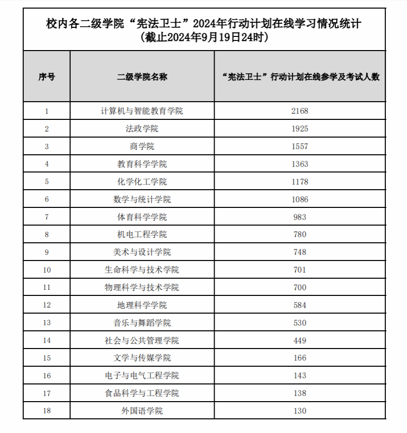 活动得到了各二级学院的大力支持,学生积极参与,现公布第三周各单位学习进展情况(截至9月19日24时),请尚未按要求落实学考工作的二级学院督促本院学生抓紧完成(一、二、三年级学生学考率达100%,四年级学生学考率不低于95%)。学校依法治校工作领导小组办公室将于每周定期公布学考情况,形成比学赶超的学法氛围。