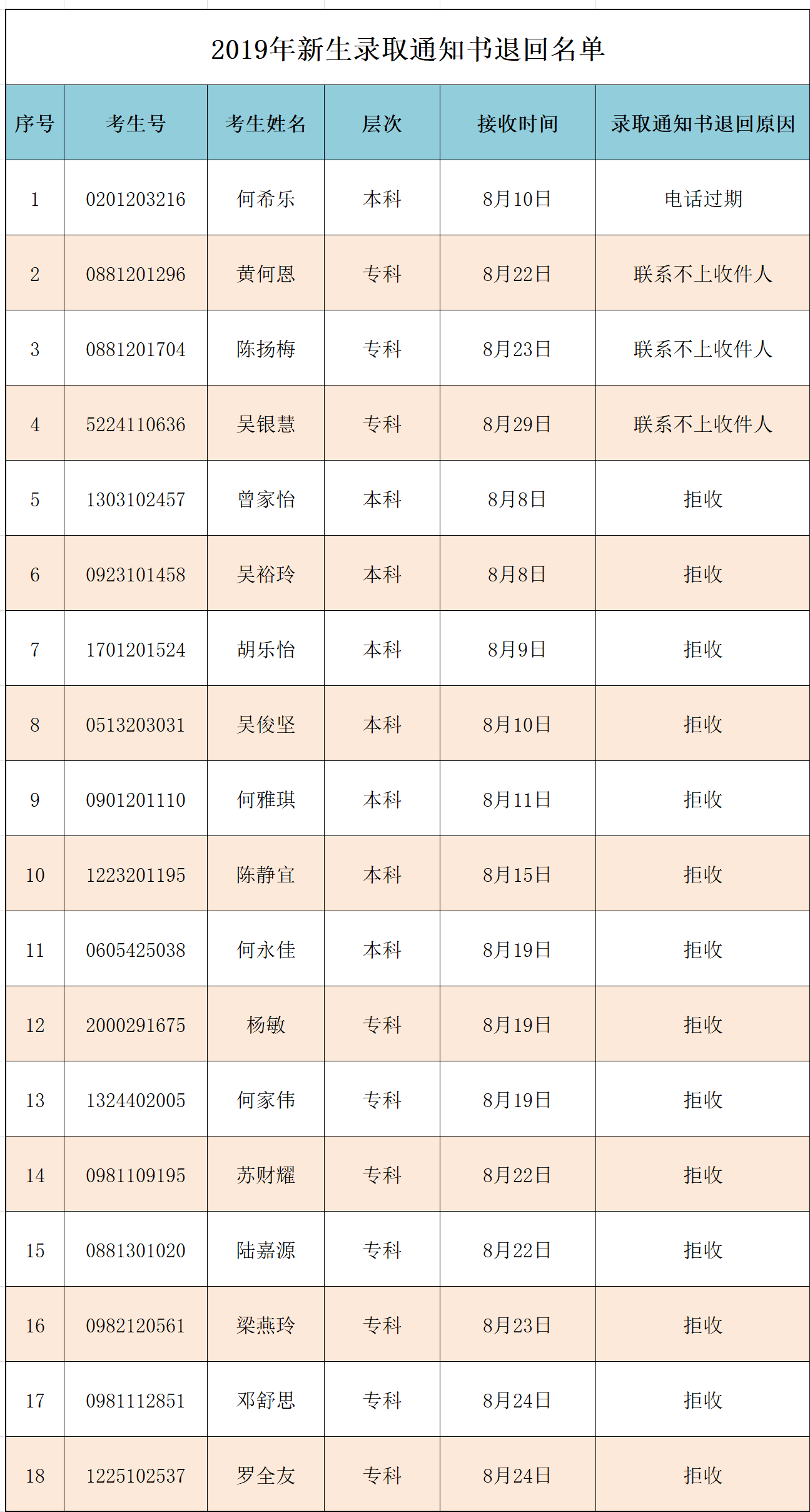我校2019年本科和专科录取通知书分别于8月3日、6日、14日通过邮政EMS快件方式寄出,由于个别新生高考报名时填报的联系方式有误,导致邮件无法投递被退回。我校对退回的邮件尝试各种方式联系考生,然后会再次邮寄,但仍有考生无法联系上。请考生看到公告后速与我校招生办公室联系,联系电话:0759-3183211。若9月3日前仍无法联系邮寄,我校将会对这些邮件当拒收件处理。