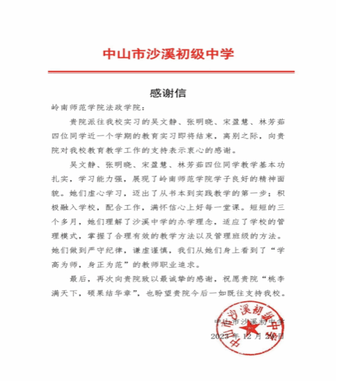 近日,法政学院收到来自中山市沙溪初级中学的感谢信。感谢信对法政学院2023年9月份安排到该校实习的四名实习生给予了充分的肯定和赞许,对岭南师范学院师范生扎实的基本功、虚心的学习态度、强大的学习能力、良好的精神面貌给予了高度的评价。对岭南师范学院法政学院派出优秀实习生到贵校实习致以衷心的感谢!