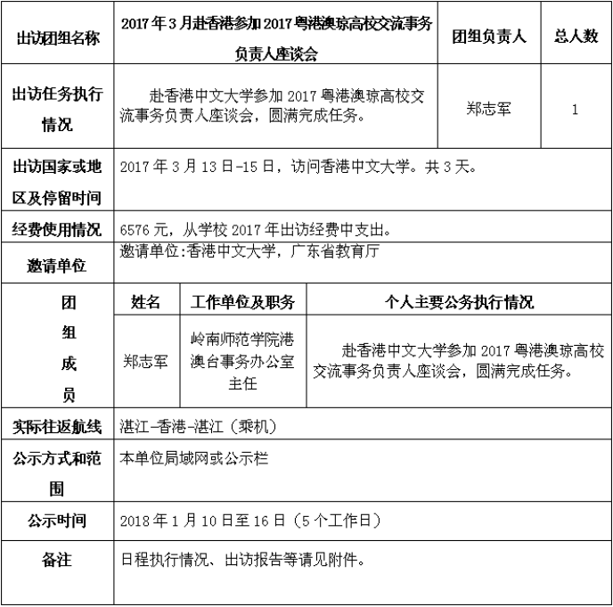 应广东省教育厅和香港中文大学的邀请,我校港澳台事务办公室郑志军主任赴香港中文大学参加2017粤港澳琼高校交流事务负责人座谈会。出访日期为2017年3月13日至15日止,所有费用由我校负担。
