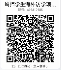 递交报名表的同学,请扫码加入“岭师学生海外访学项目QQ群”,便于后期相关事项的联络与通知。