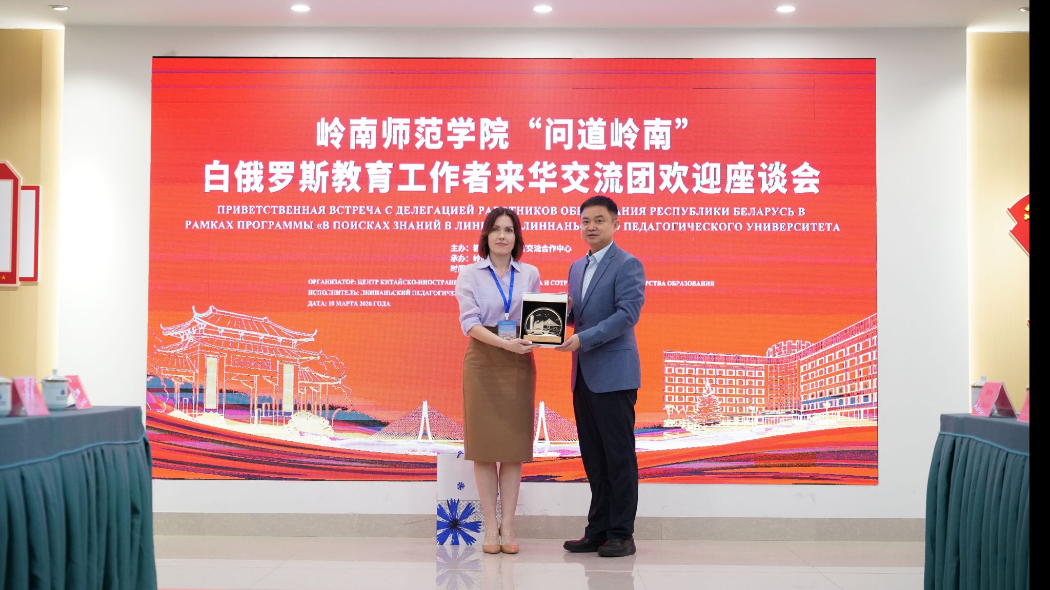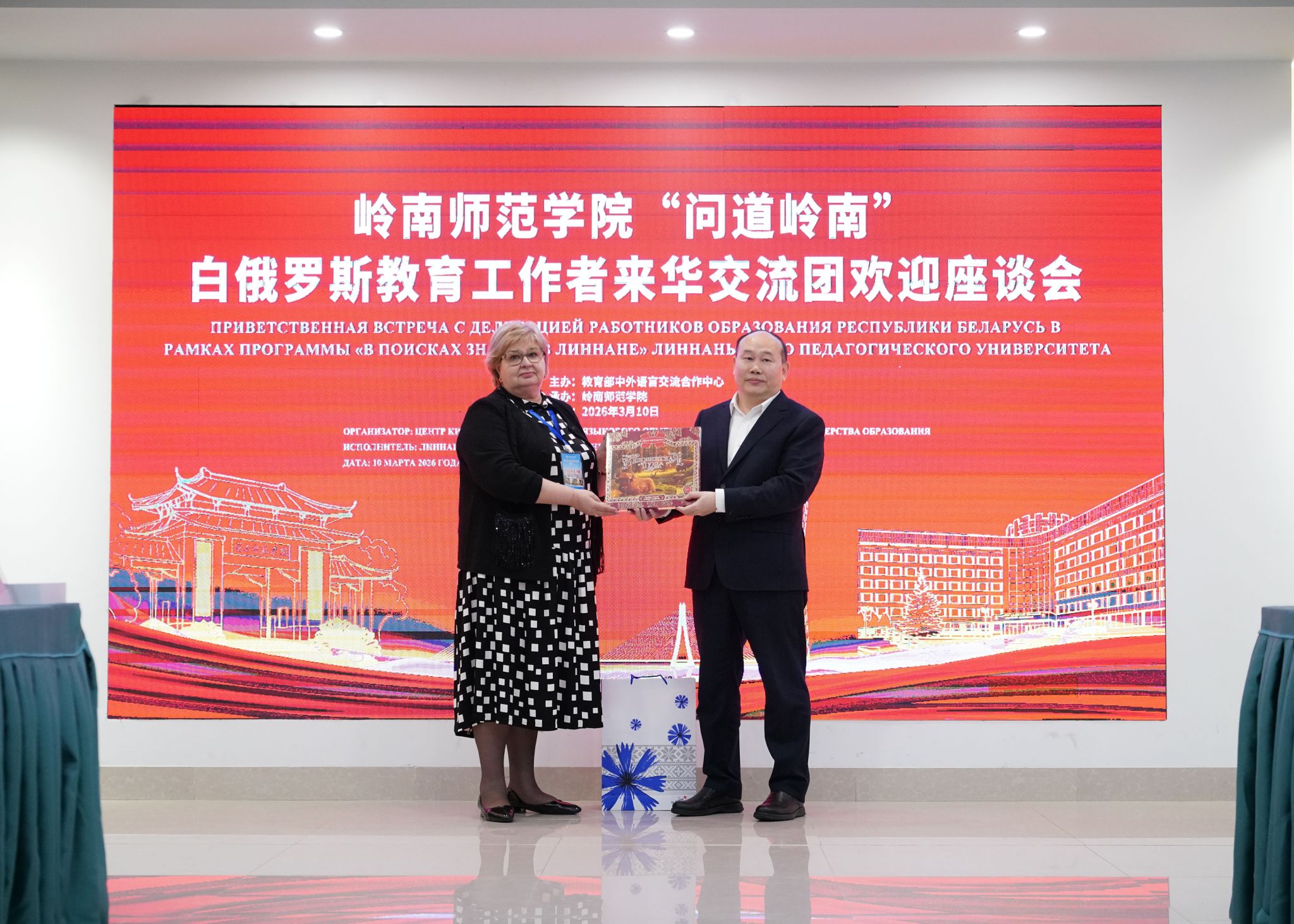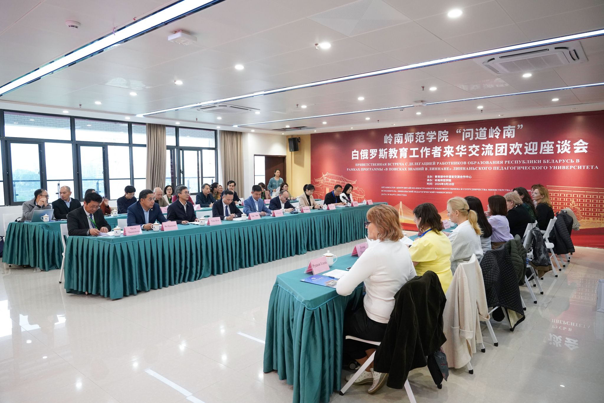 岭师新闻中心讯:三月岭南,春意盎然。3月10日,白俄罗斯教育工作者代表团一行到访湛江,“问道岭南”来华交流欢迎座谈会在学校第五教学楼举行。学校党委书记阳爱民,副校长唐宇,湛江市副市长吴国雄,市外事局局长王敦滟,市教育局局长陈升等出席活动,与远道而来的教育同仁共叙中白友谊,共绘合作蓝图。