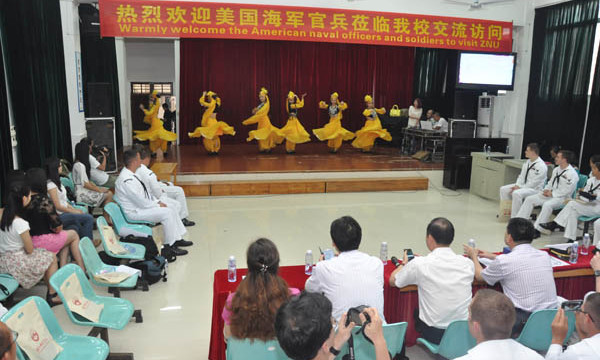 随后,音乐学院师生为这次会议进行了精彩的民乐合奏和民族舞蹈表演,体科院同学的武术表演《南拳》,刘福瑞书记倾情演唱的《达坂城的姑娘》把表演的气氛带到了最高点,这一系列有着浓郁的中国民族风情的表演让美国官兵感受到了我国少数民族特有的风情。作为回赠,官兵也进行了大合唱。交流会结束后,美舰官兵与师生们合影留念。