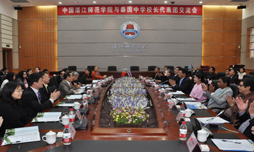 岭师新闻网3月17日讯 15日上午,泰国26所中学校长代表团来校访问,与我校签订合作协议。上午8时,我校在国际会议厅与来访的泰国26所中学校长代表团举行了交流会并分别与26所泰国中学签订合作协议。除来访的26所中学校长代表团37人之外,我校刘周堂副院长、国际交流与合作处邓逢光处长、人文学院谢应明书记、教科院范兆雄院长、外语院曹志希院长、晋学军副院长、冯彩莲副书记、国际交流与合作处郑志军副处长、肖建春副处长和相关工作人员,我校2012年曾经参加赴泰实习项目的部分同学,来自泰国中学在我校参加汉语学习和中国文化体验营的师生31人以及泰国SPN公司代表出席了此次交流会。邓逢光处长主持会议。