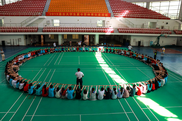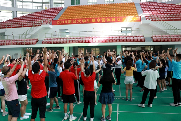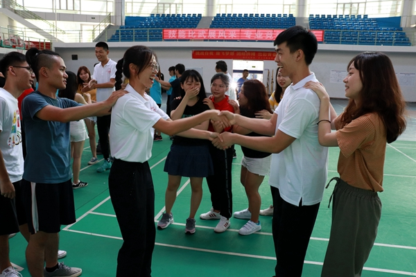 岭师新闻中心讯:数十个三人组成的“小鸟巢”在主持人的口令下迅速地围成 “大鸟巢”,不久后,分散开来的“鸟儿”们手搭彼此肩膀,又变成了一条“大长龙”,龙头龙尾结合,最终形成一个坚固无比的大圆圈。7月2日下午,120名湛台大学生在岭南师范学院的体育馆内进行了一场主题为“两岸一家亲”的大型游戏。活动由台中教育大学兼任讲师范国梁主持。