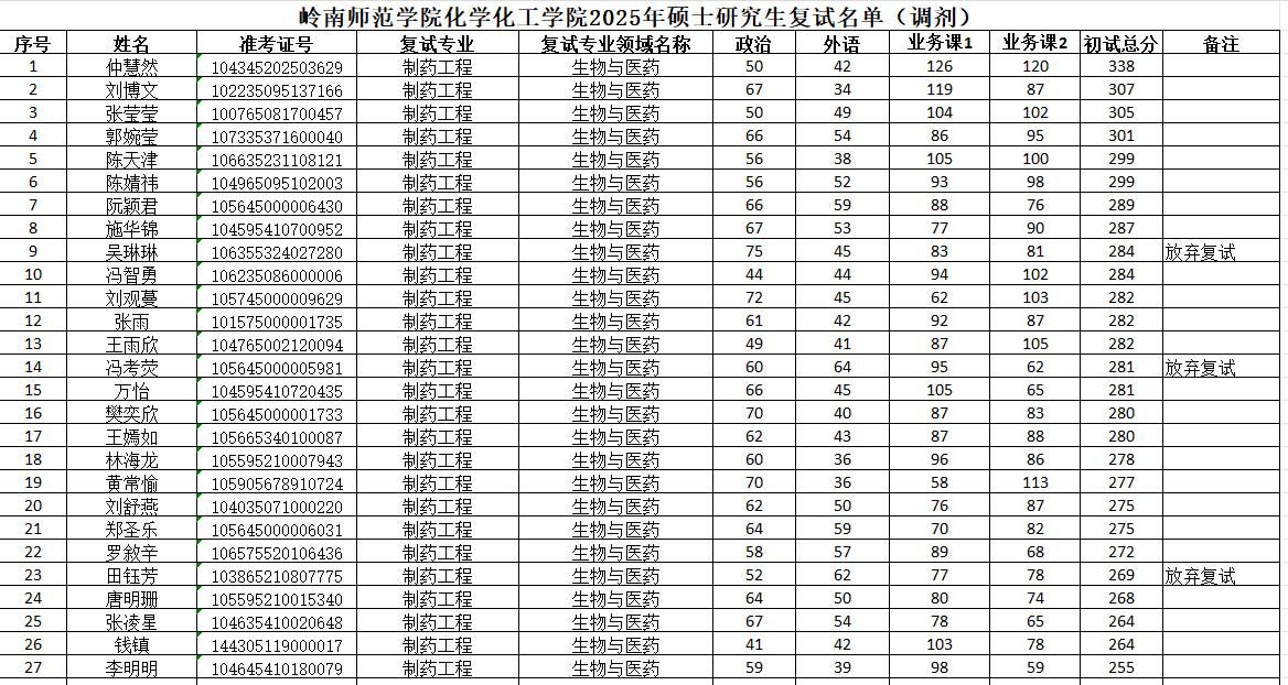 根据学校复试调剂办法及学院实施细则,结合我院调剂申请情况,经审核,我院2025年硕士研究生复试(调剂)考生名单公告如下: