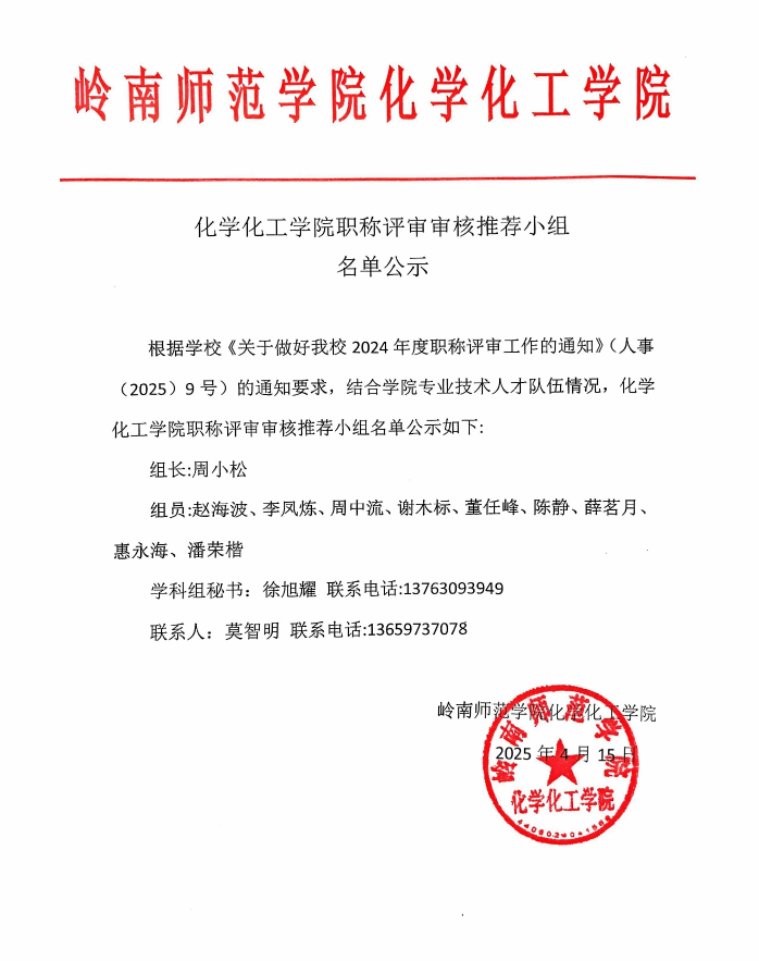 化学化工学院职称评审审核推荐小组名单公示
