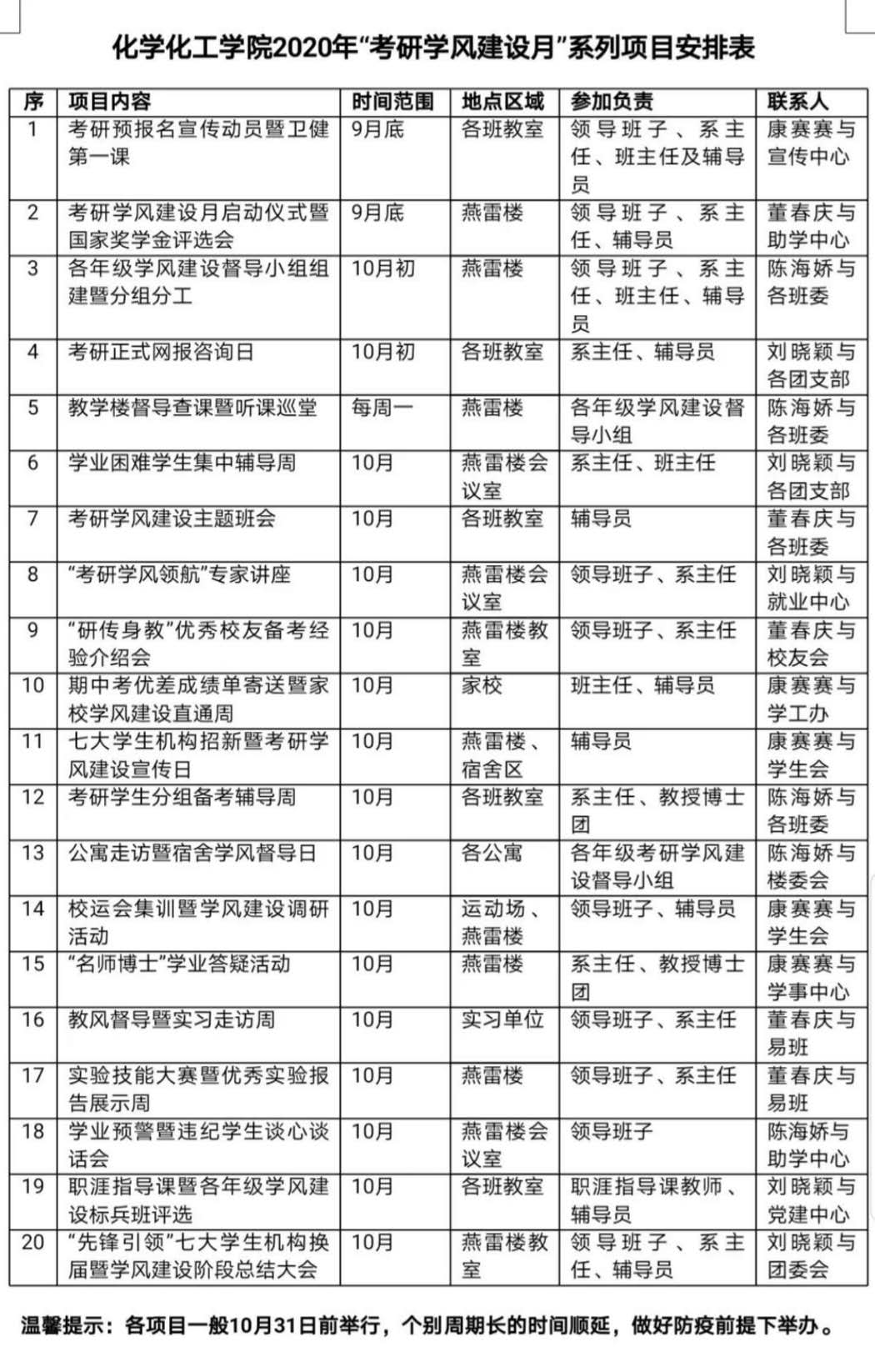 化学化工学院2020年考研学风建设月系列项目安排表