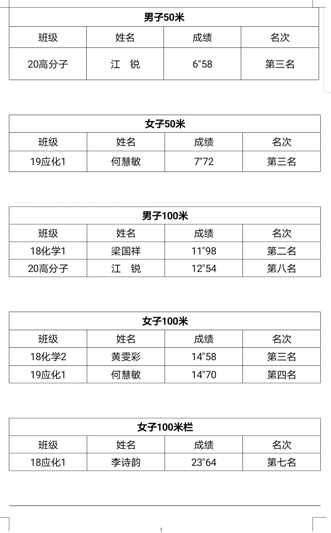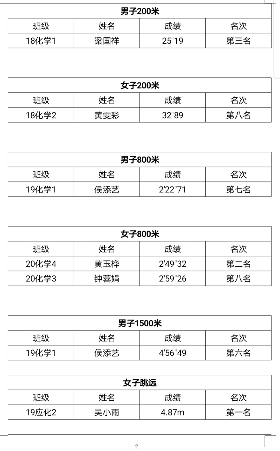 2020年校运会化学化工学院学生代表队获奖项目名单(团体总分第三)