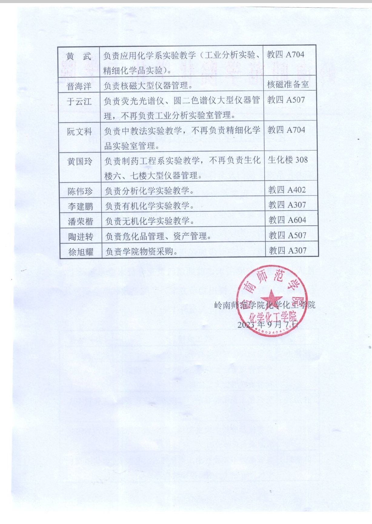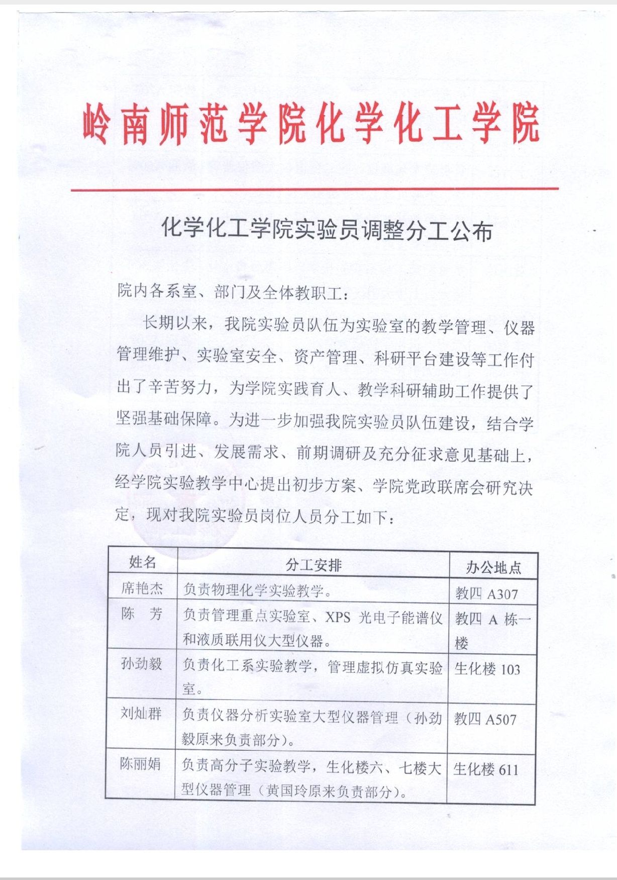 化学化工学院实验员调整分工公布