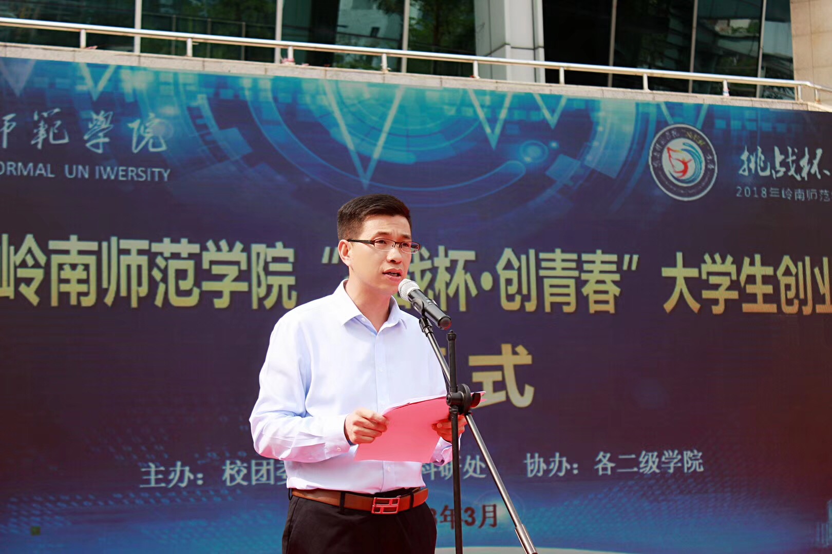 为了进一步鼓励广大师生积极投身于科技创新创业的浪潮中, 3月24日下午,岭南师范学院于体育馆前举办以“挑战杯 创青春”为主题的大学生创业大赛开幕式。出席本次活动的嘉宾有校党委黄达海副书记、邵乐喜副校长、学生工作部兼招生就业部李粤处长、教务处刘惠卿处长、科研处金义富处长以及各二级学院领导。本次活动由校团委李发武书记主持。