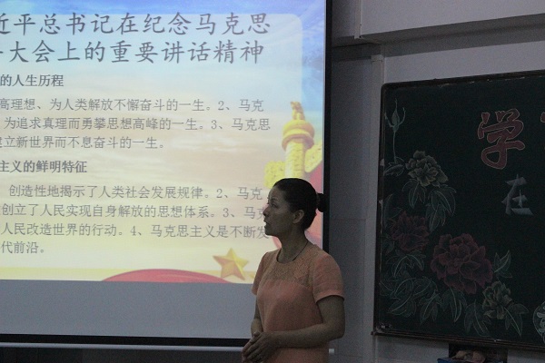 学院党委张飞燕书记传达讲话精神。她指出,习近平总书记在纪念马克思诞辰200周年大会上的重要讲话主要是围绕四个方面展开:一、从“三个一生”评价马克思的人生历程;二、用“四个理论”概括马克思主义的鲜明特征;三、用“三个飞跃”总结了马克思主义在中国创造的奇迹;四、用“九个思想”指明如何学习马克思。她认为,学习贯彻习总书记的系列讲话是重要的,也是必要的,广大师生务必认真学习、深入领会,把习总书记的讲话精神内化于心、外化于行。同时,张书记还强调,新时代大学生要牢记马克思主义的基本理论,更应学以致用,把马克思主义的思想原理运用到新时代的学习、工作和生活中,做到真学、真信、真用。