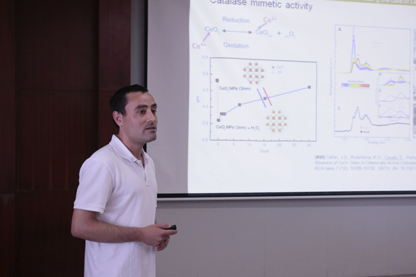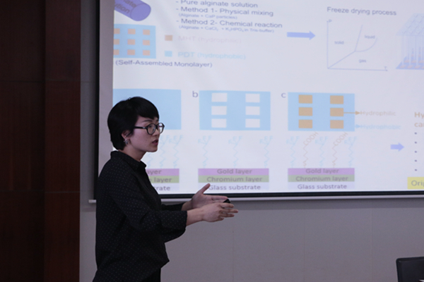 Eudald研究员做了关于“纳米粒子在医学、催化和环境中的作用”的全英学术报告,此外,在报告的开始介绍自己以及自己的家乡西班牙巴塞罗那。Eudald研究员获得了丰硕的科研成果,已发表了很多篇SCI论文。现场,全体出席人员聚精会神地聆听学术报告。随后,曾牡玲研究员做了关于“功能性生物材料:纳米分散相、纳米晶和生物矿化作用”的学术报告。她用生动形象的语言,全方位地介绍了博士和博士后期间的科研工作,以及取得的科研成果。曾牡玲研究员已经发表大量的SCI文章,还有几篇论文处于待发表状态,其中一篇是正在审稿中的PNAS文章。