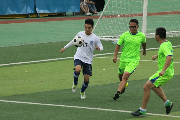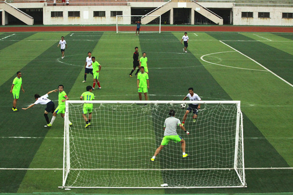 随着主裁判在中圈附近一声清脆响彻的哨声,决赛正式拉开帷幕。上半场,我院男足凭借着强大的防守体系,良好的团队合作精神,压制住教工队的猛攻,双方陷入激烈的“肉搏战”,我院男足球员冲锋陷阵,一次次跌倒,一次次爬起,进攻,防守,抢点,落位,切换,跑,跳,转,跃,竭尽全力,力争进球。在我院男足队员使出漂亮的“撞墙配合”突到禁区前仍无法攻破对方球门后,上半场结束,双方均无建树。
