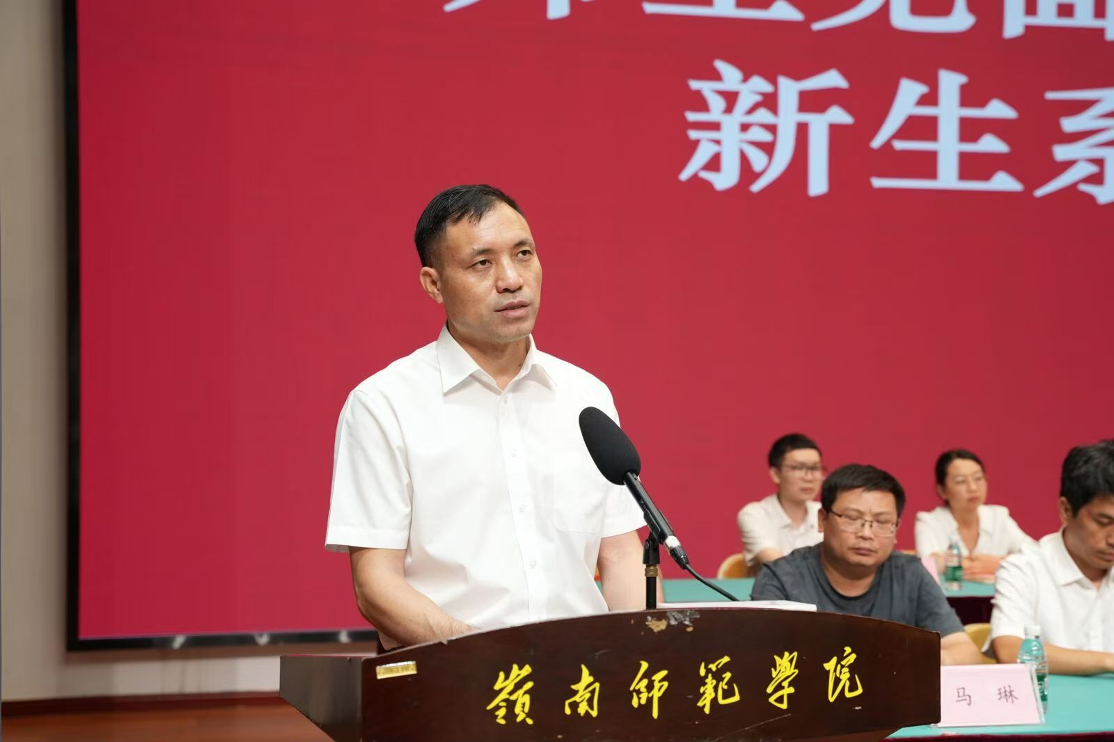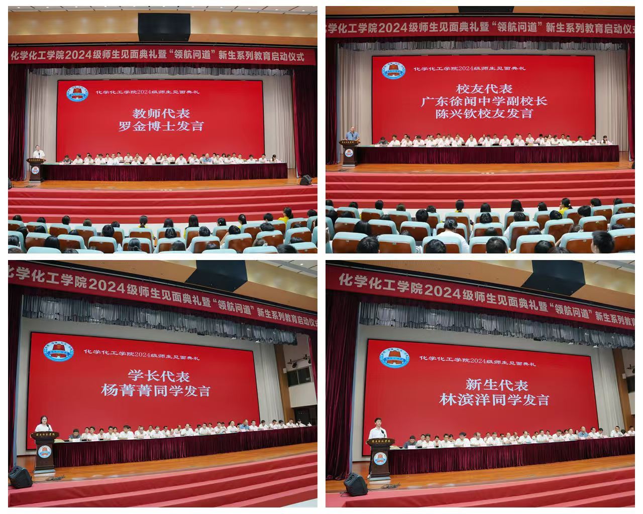 学院教师代表罗金博士发言希望同学们在学习生活中主动探索,赋能自我,修身立德,塑造健康人格,积极参加学校、学院各种活动,在大学四年丰富自我,逐渐成长;广东徐闻中学副校长、学院2007届优秀校友代表陈兴钦以自己的亲身经历和感悟,向新同学传授学习方法和做人道理,希望新生能做好大学生涯规划,主动学习,积极积累,勇于实践;学长代表、2021级应化2班杨菁菁同学发言介绍自己在学院学习生活、工作经历及学科竞赛系列实践过程,以自己的成长求索历程鼓励新生自强不息,不断进取;新生代表、高分考试入校的2024级化学1班林滨洋同学在发言中感谢学院领导老师及师兄师姐的热情迎新接待,表示很荣幸成为化学化工学院大家庭一员,对未来学习生活充满憧憬和期待,希望自己坚定信念,迎接挑战,创造无限可能。
