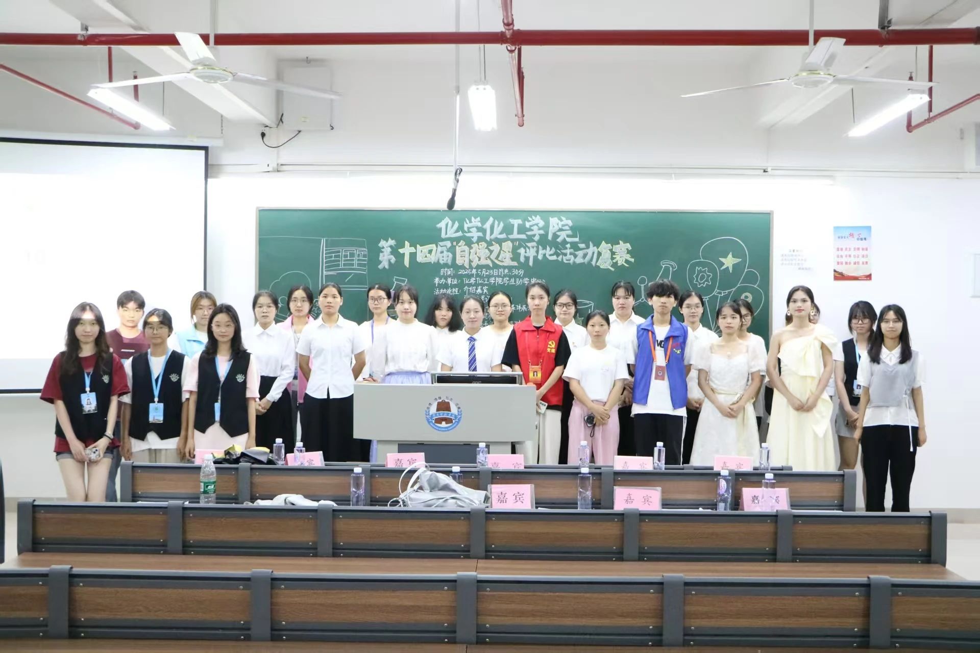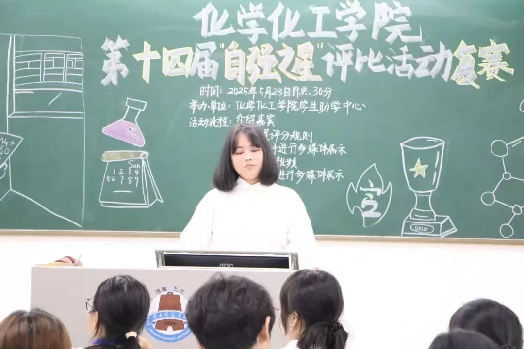 近日,化学化工学院学生助学中心于第五教学楼A栋215室举行2025年十大“自强之星”评选活动。出席活动的有学院辅导员杨肖慧老师、兄弟学院学生干部代表、学院七大学生机构负责人及复赛选手、各班观众等。