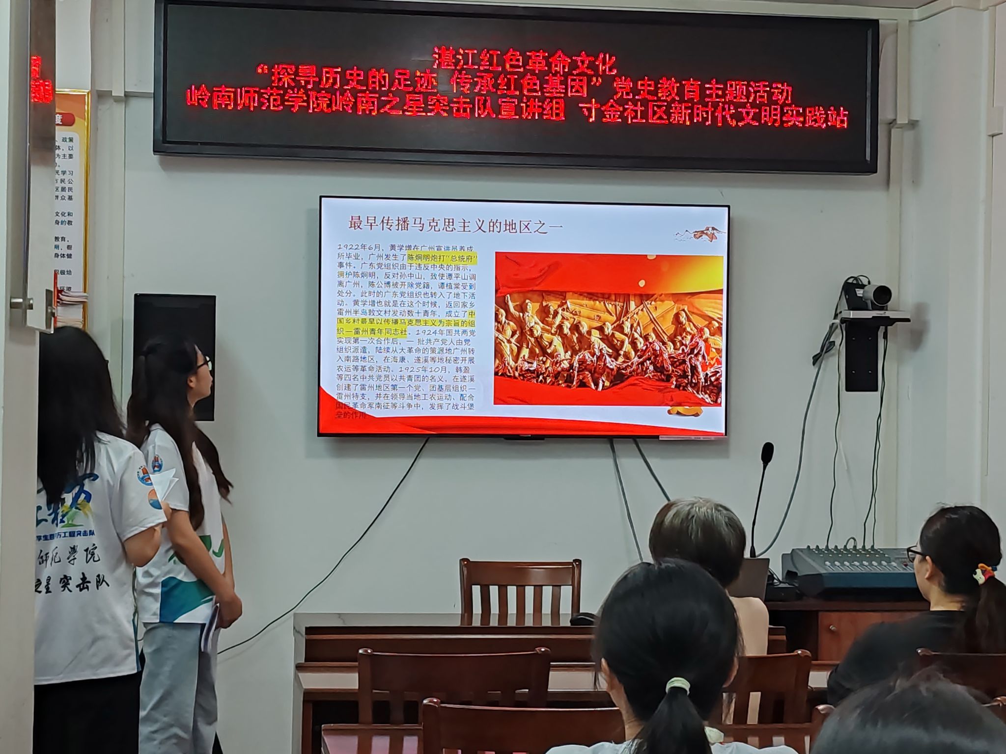 宣讲中提到,湛江是最早传播马克思主义的地区之一。1922年,黄学增回到家乡雷州半岛,成立雷州青年同志社,播撒革命火种。同时,湛江也是最早组织农民暴动和建立农民武装的地区之一,1927年的“乐民起义”打响了南路武装反抗国民党血腥屠杀的第一枪。抗战时期,湛江更是抗日的重要战场,1943年成立的“雷州抗日游击队”、1944年的“老马起义”以及1945年成立的“南路抗日人民解放军”,在敌后战场留下了英勇抗敌的壮烈篇章。