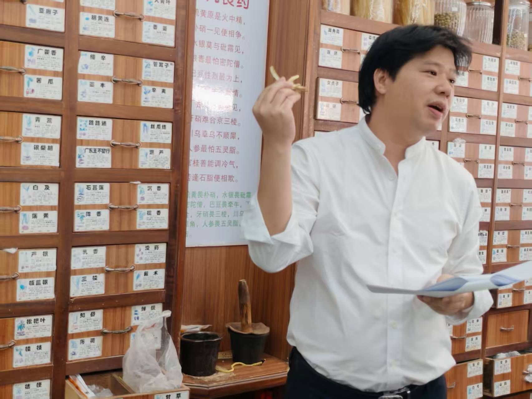 抵达同安堂后,林家胜先生介绍道,同安堂养生茶制作技艺至今已有百余年历史,作为石岭镇唯一的非遗传承项目,其独特之处在于将中药理论与茶叶制作巧妙结合,根据不同体质研发出针对性的养生茶方。比如针对手脚冰凉,月经疼痛的朱雀火元茶,降火润喉的同安甘露茶。