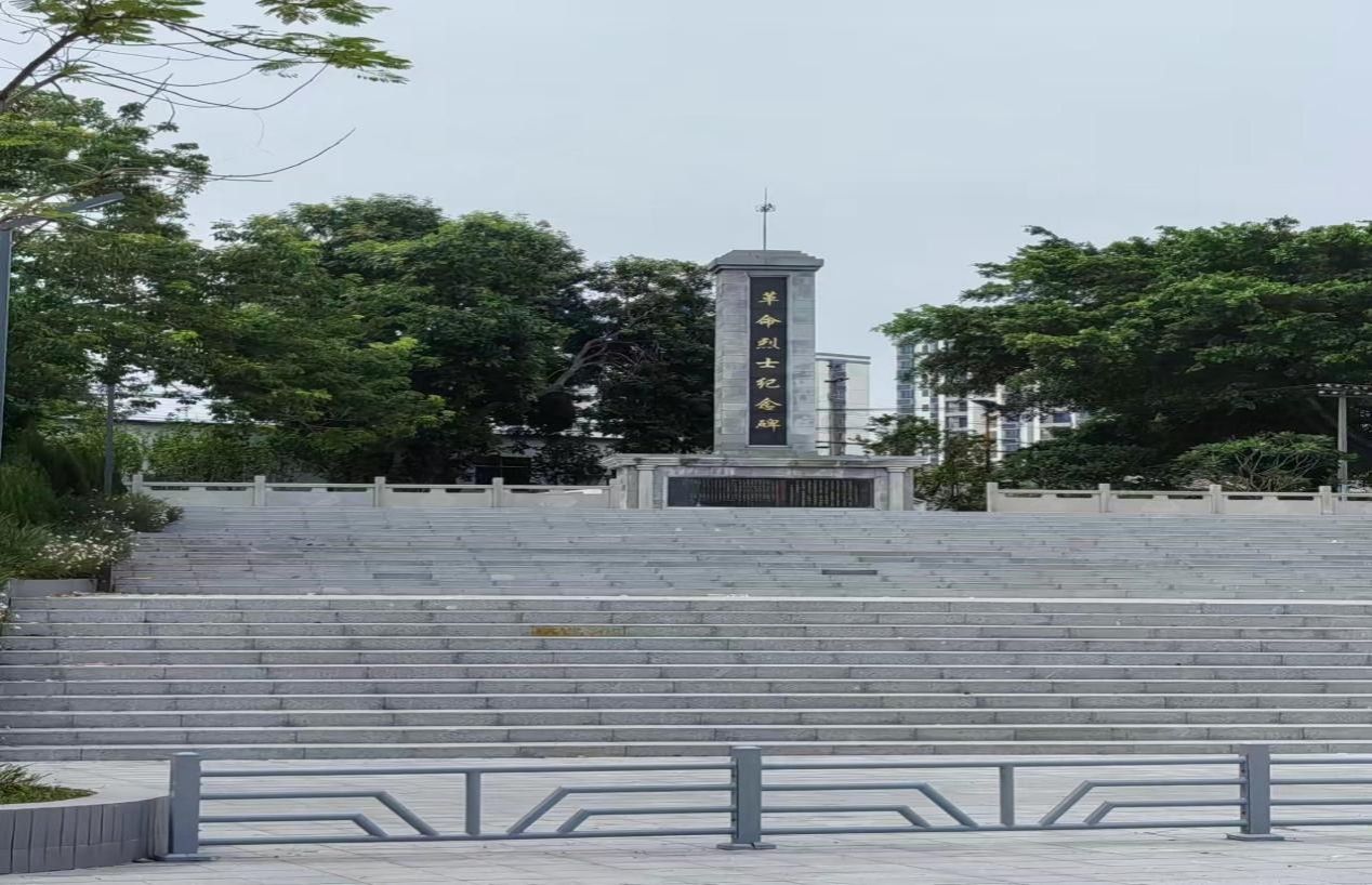 经过一段路程,茶粽铁韵突击队终于到达了目的地。映入眼帘的先是一片宽阔的广场,广场门口矗立着一座刻着“石岭公园”的石碑,在古老的石碑旁边,巍然矗立着一棵历经百年风雨洗礼的古树,它枝繁叶茂,树冠如盖,为那些匆匆过往的行人提供了极为宜人的庇荫之处。无论是烈日炎炎的夏日,还是微风拂面的春秋,这棵古树都以其坚韧的生命力和无私的奉献精神,默默守护着这片土地,成为行人心中的一方清凉绿洲。广场之中,孩童们在广场上尽情奔跑,笑声盈盈,老人们则悠闲地摇着扇子,脸庞上洋溢着满满的幸福感。广场中央,一座庄严肃穆的烈士纪念碑巍然矗立,该碑建于1971年6月,为的是永远铭记在廉江解放战役中英勇捐躯的百余名烈士。这座纪念碑,不仅是向革命先烈们深情的缅怀,也成为了传承革命红色基因、发扬革命精神的重要象征。正是在这些革命烈士的无私奉献之下,得以拥有今天这洋溢着幸福的笑颜。