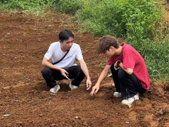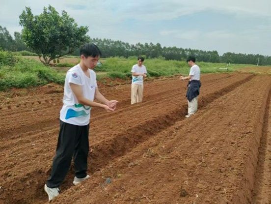 在树脂播种现场,“保稼护航”突击队队长洪班超与耀富省级农场经验丰富的工作人员和基地负责人杨即兴交流有关花生的生长过程和树脂的有关应用。同时,队员们热情高涨,分工明确,有的负责浇水,有的负责放吸水树脂。大家齐心协力,动作从陌生到迅速而熟练,每一个环节都严格按照工作人员和负责人的技术要求进行。