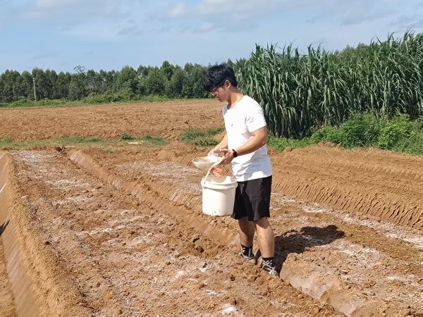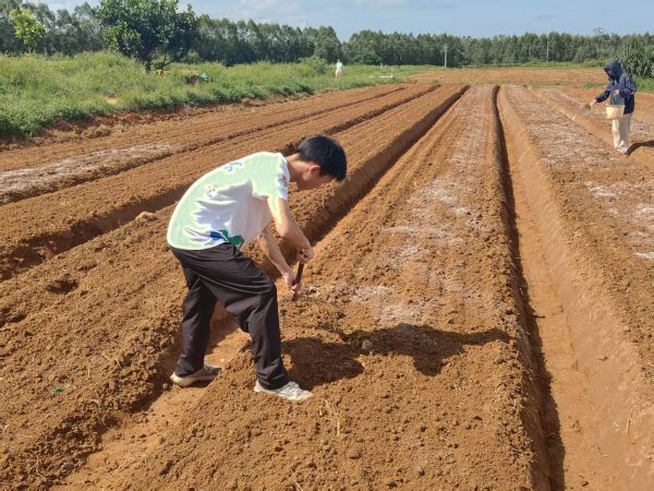 在农场现场,突击队成员们分工明确、行动有序。新闻组成员负责拍摄工作,调研组和研发组在农田撒树脂粉末,其次为土壤浇水,耕土。他们手持工具,将吸水树脂均匀混入土壤,这些看似不起眼的吸水树脂,却凭借自己的高效作用成为农业生产的一个个“小卫士”。面对连片的农田,队员们不惧烈日,任劳任怨,仔细把控铺设密度,认真为每一片土壤浇水,一丝不苟地拿耕土工具把粉末树脂均匀混合,确保每一寸土地都能发挥吸水树脂的最大效能,为后续作物扎根生长筑牢水分“储备库”。