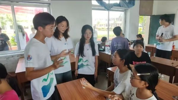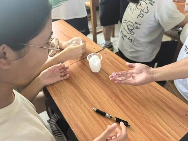 在课堂结尾,队员关艳茹和曹冬月先向学生介绍了“保稼护航”突击队来沙扒的目的,从而引出突击队研发的产品——吸水树脂。队员们协同”逐光“义教队伍分发树脂给学生们,并用水装满每一个杯子,让学生们直观地感受微观世界的奇妙。面对学生们的疑惑,队长洪班超也用通俗易懂的语言向他们讲解了树脂的吸水原理。为了让大家深入体验,队员们还准备了分装成小袋的树脂,分发给部分学生,鼓励大家回家探索吸水树脂的更深原理。