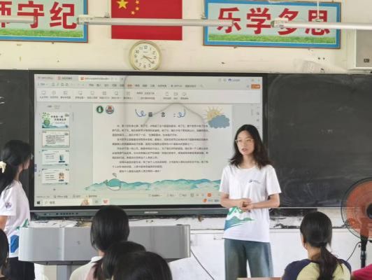 本次课程由“保稼护航”突击队的曹冬月与关艳茹担任主讲。广东技术师范大学 “逐光” 支教队队员在一旁辅助,引导学生们积极参与,现场气氛热烈活跃。课堂上,两位老师通过生动的案例讲解和互动提问,引导学生们认识水资源的重要性、当前面临的水资源挑战及日常节水小技巧。“你们知道一个没关紧的水龙头一天会浪费多少水吗?”“日常生活中哪些做法能有效节约水资源?”一系列贴近生活的问题抛出后,同学们纷纷举手发言,分享自己的见解与经验。有的同学提到用洗菜水浇花,有的建议及时修理漏水的水管,课堂气氛活跃而热烈,环保意识在互动中逐渐深入学生心中。