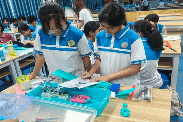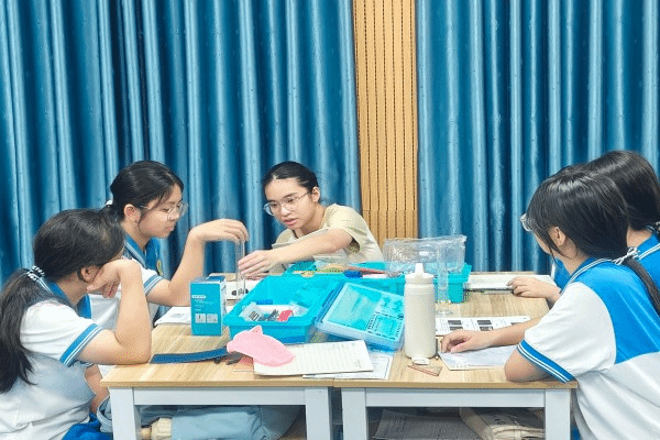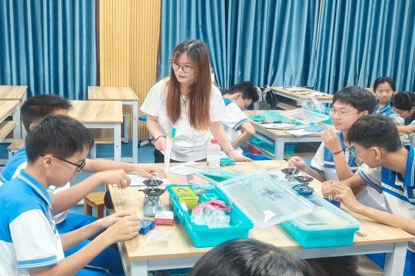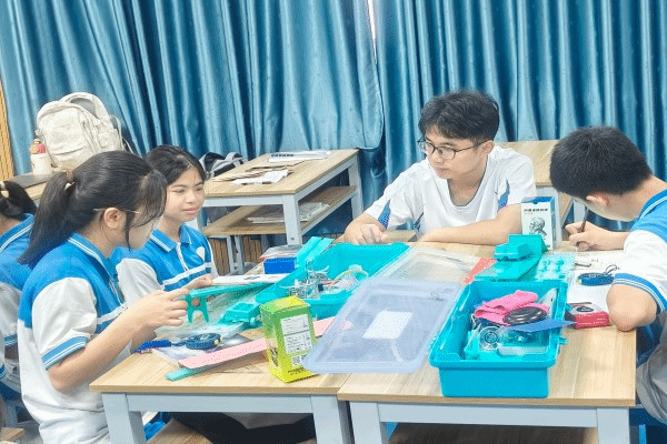 经过前期的课堂教学与相处,“星火启明”突击队队员与学生们已较为熟悉,这使得本次实验课交流氛围轻松活跃,充满探索热情。植钧、郭静盈、甘晓仪三位队员担任授课老师,他们穿梭于各学习小组之间,时而俯身指导操作,时而提出问题引导思考,让知识在互动中自然传递。