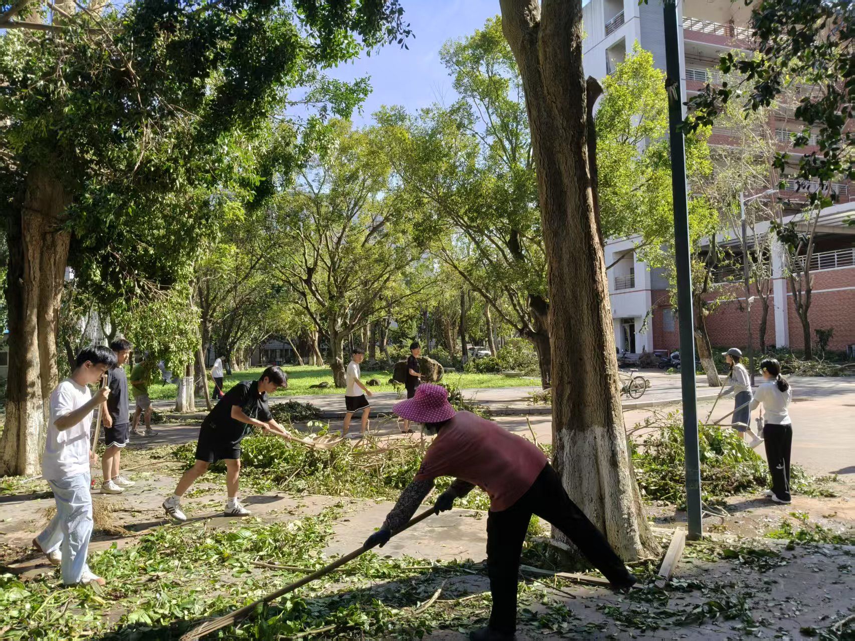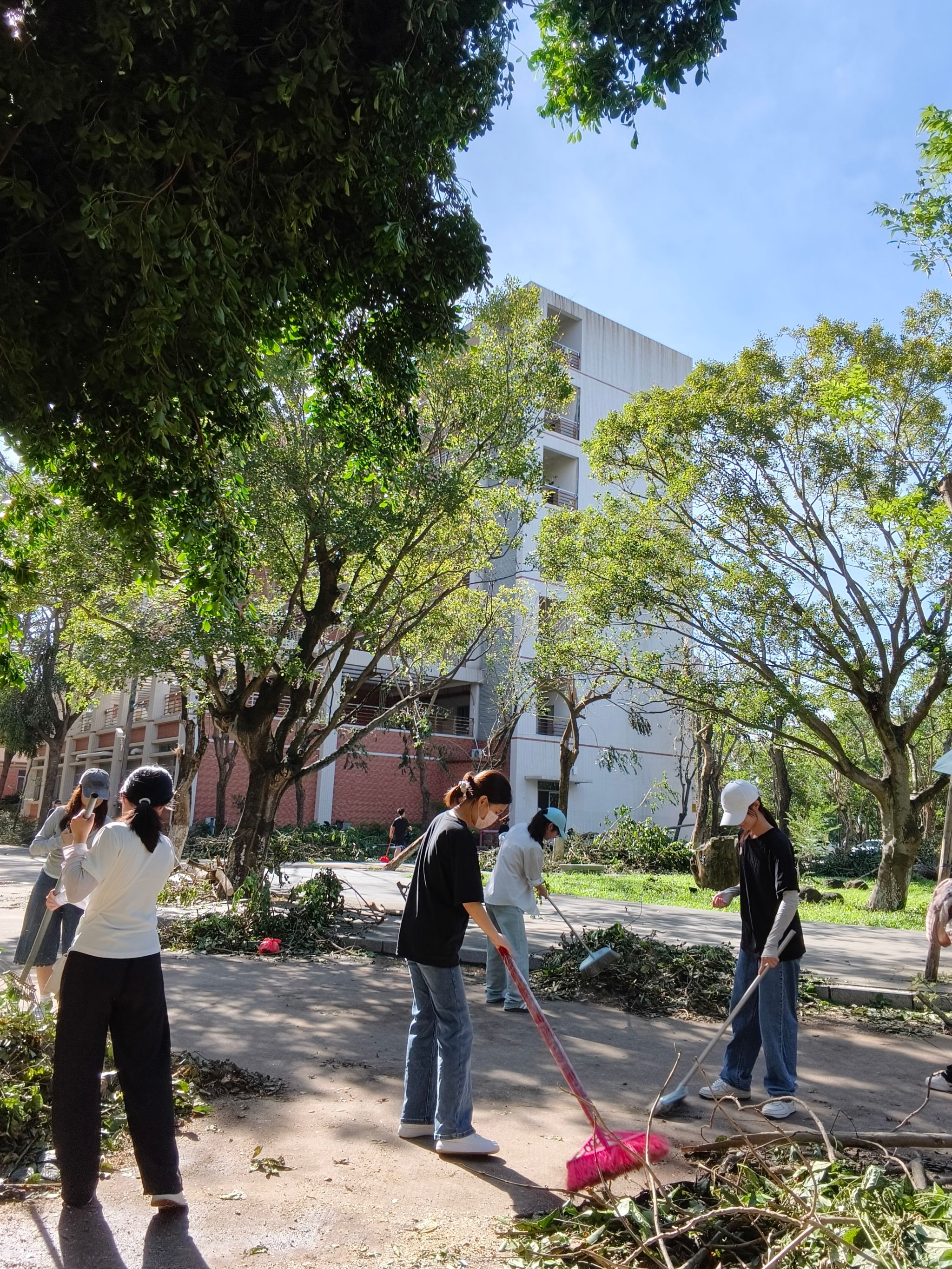 受今年台风“麦德姆”影响,学校校园遭受不同程度灾害。风雨过后的10月7日,化学化工学院师生迅速响应学校布署号召,当天在做好值班值守、救灾复学基础上组织在寸金校区尚雅苑、昌明苑及十三期等公寓留宿同学,与年级辅导员班主任等师生,除了主动搞好学院班舍内及阳台卫生外,自觉助力清理舍外公共走廊、附近楼道、苑区大院及学校大道落叶断枝,全力以赴助推复工复产复课复学。