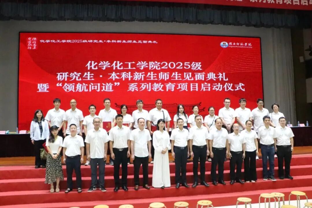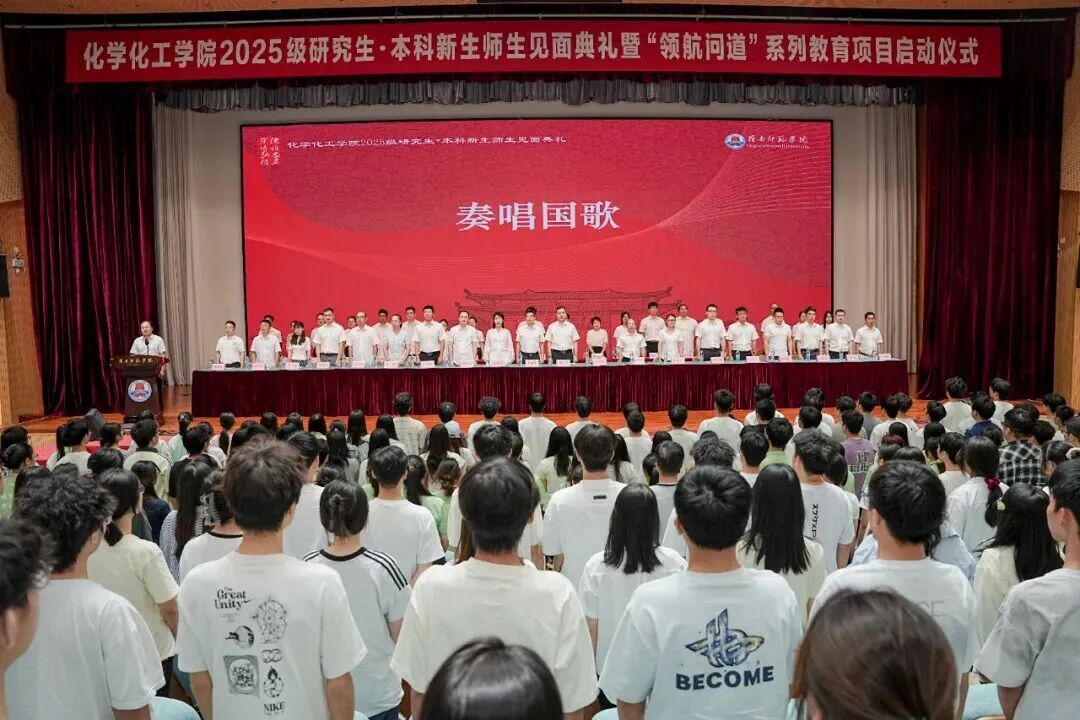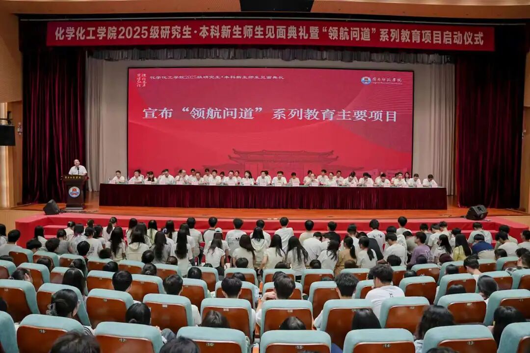 时维金秋,硕果飘香。近日,化学化工学院在学校音乐厅举行2025级研究生·本科新生师生见面典礼暨“领航问道”系列教育项目启动仪式。学院党政领导班子成员,系、室、办、中心主任,25级硕导,班主任,辅导员,教师代表,校友代表,学长代表,七大学生机构主要负责人,25级助班及25级全体600多新生参加。典礼仪式由学院党委副书记、纪委书记李凤炼主持。