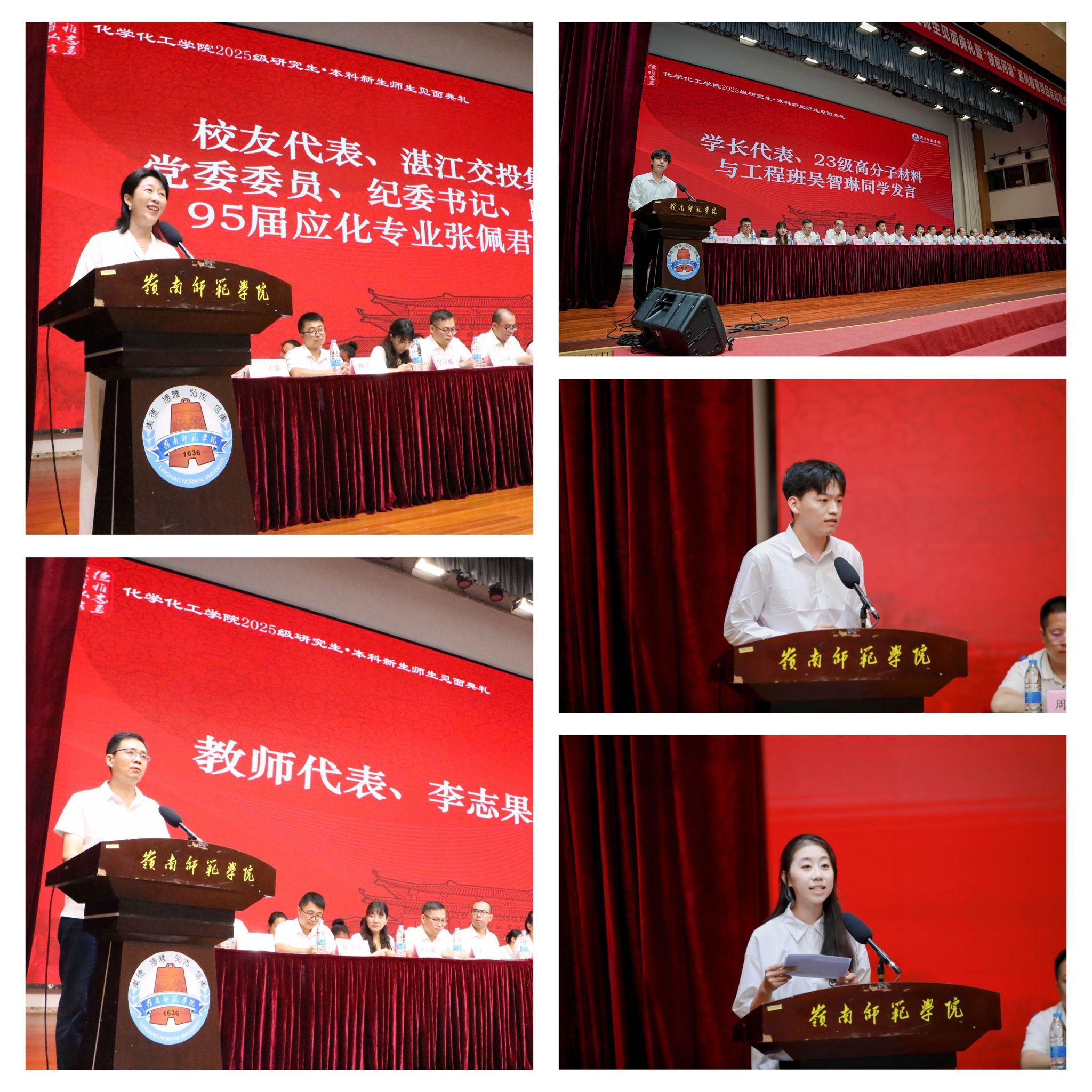 学院教师代表李志果教授热烈欢迎化学化工学院新生,向同学们强调化学化工的重要性,并希望同学们能够以德为先,诚信治学;主动学习,积极探索;勇于创新,不惧失败;注重团队协作,共同进步。表示学院教师将全力支持,助力学生成长为有担当的专业人才。校友代表、湛江交投集团党委委员、纪委书记、监察专员,95届应化专业张佩君校友发言回顾了个人职业发展并向同学们分享了自己的感悟,希望同学们能够锤炼硬核本领、守护身心健康、珍惜校园时光、坚守清正廉洁。学长代表、23级高分子材料与工程班吴智琳同学建议师弟师妹们要学基础、重实践、拓视野、参与实践,鼓励大家做新时代的化院人。研究生代表、25级研究生班陈献麒同学勉励研究生新生们深入探索创新,号召大家共践校训,为学院和社会的发展贡献力量。本科新生代表、25级化学3班张子涵同学分享了自己的求学初心与校园初印象,致敬感谢学院领导老师和师兄师姐们为迎接25级新生到来所作的大量迎接工作和每天的军训跟训,希望同学们共谱大学发展的新篇章。