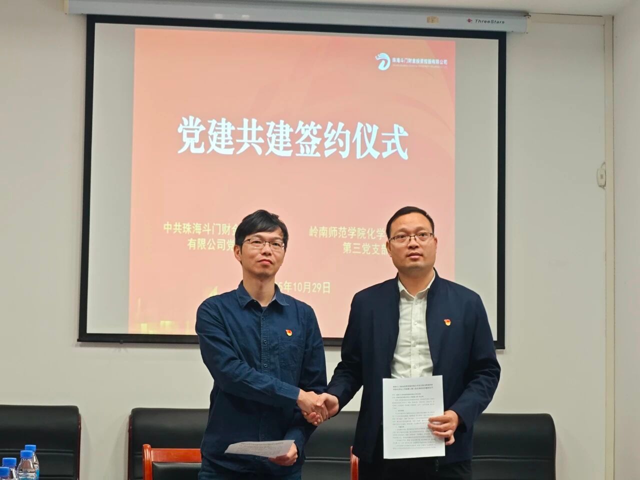 为深入贯彻落实新时代党的建设总要求,创新基层党建工作载体,搭建高校与地方企业互动交流桥梁,10月29日,化学化工学院教工第三党支部与珠海斗门财金投资控股有限公司党支部携手开展“党建共建聚合力,校企联动促发展”党建共建活动,并签订支部共建协议。学院党委书记赵海波,学院院长周小松,学院党委副书记、纪委书记李凤炼,学院教工第三党支部书记罗金及学院第二党支部书记黄武,斗门财金投资控股有限公司工会主席黎均练及支部全体党员共同出席了本次活动,仪式由珠海斗金水务环保有限公司总经理徐杰主持。