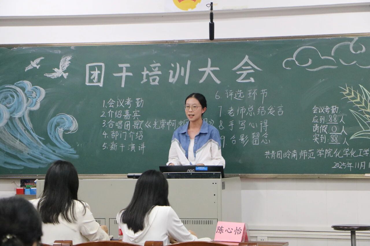 为进一步加强团干部队伍建设,提升新团干业务能力与责任意识,近日,化学化工学院团委于燕雷楼D栋601室举办2025年秋季学期团干培训会。学院团委书记陈海娇老师、团委秘书长何宇捷、副秘书长张乔博、陈心怡及全体新老团干参加培训会,努力为共青团工作高效开展扎根基。会上,新干依次上台发言,用真挚话语表达立足岗位、服务团员决心,以蓬勃向上精神风貌诠释“心存希冀,追光而遇”内涵。随后,团委秘书长何宇捷围绕团委各部门职能作讲解,从日常事务统筹、活动策划执行到特色品牌打造,系统介绍团委八部门。