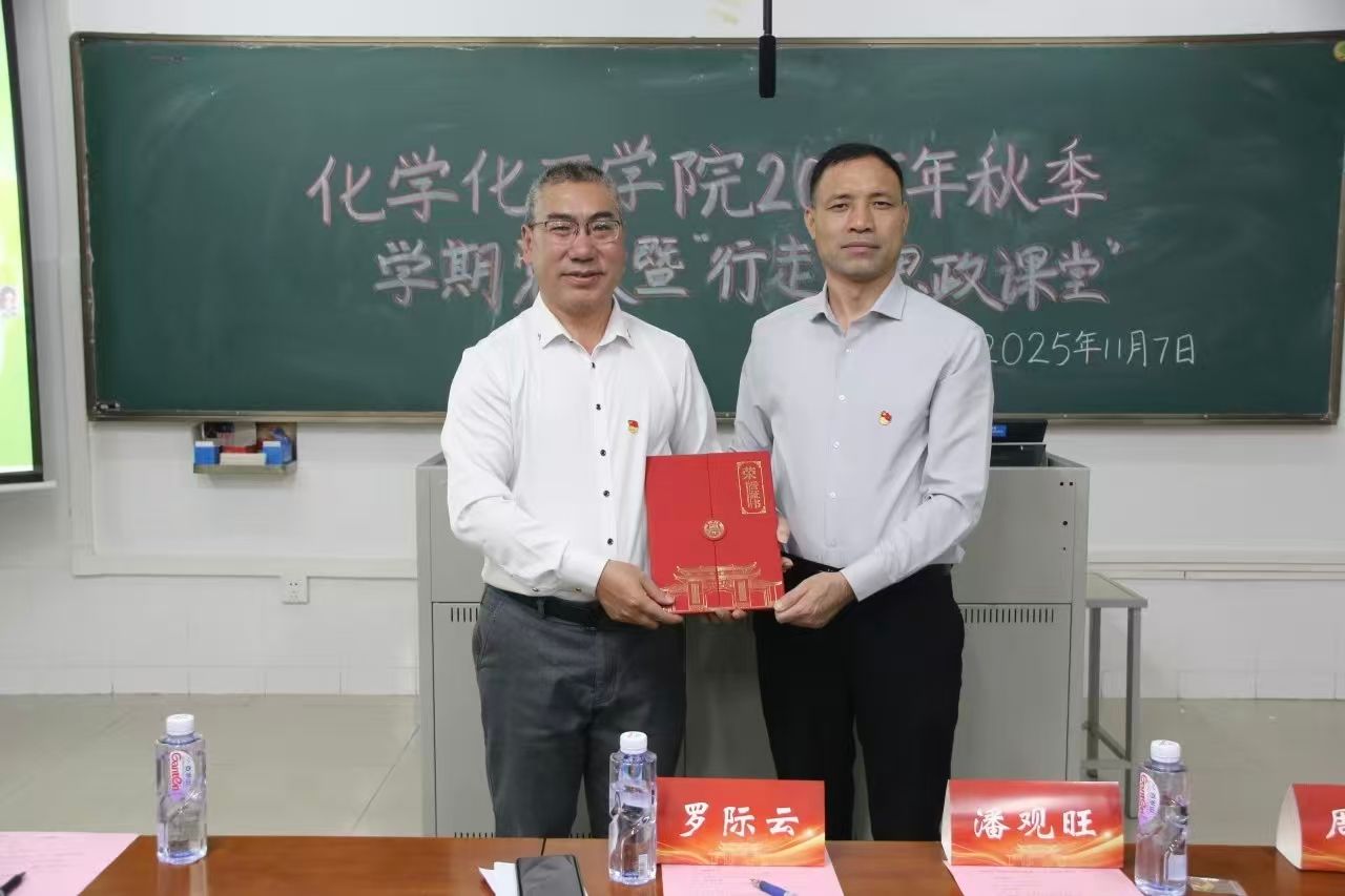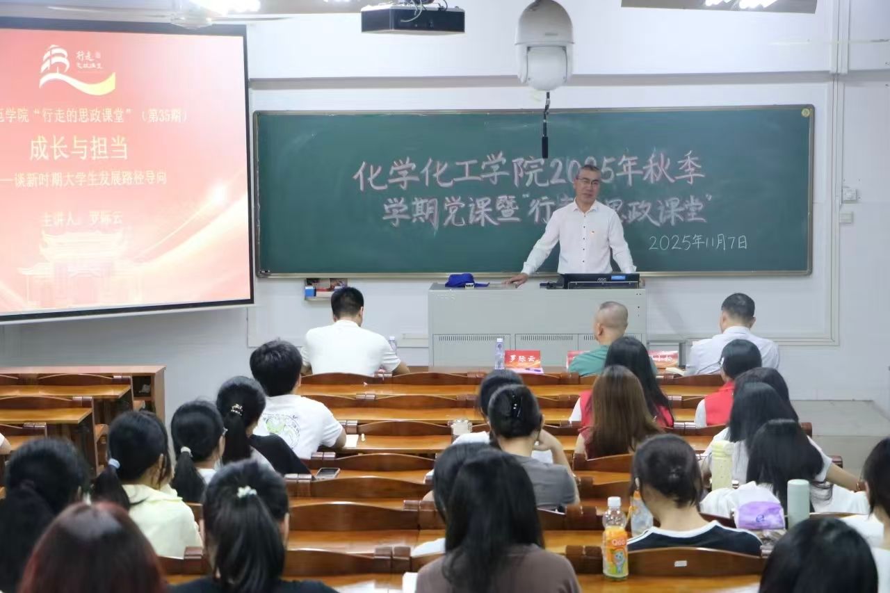 11月7日晚,化学化工学院于燕雷楼D301教室承办学校第35期“行走的思政课堂”报告会。本次活动特邀湛江第一中学麻章附属学校书记校长、学院优秀校友罗际云返校,为学院党员及入党积极分子等学生骨干带来一场“成长与担当”的报告交流。学院院长周小松出席活动并代表校院为罗际云校友颁授学校“行走的思政课堂”主讲人纪念证书。