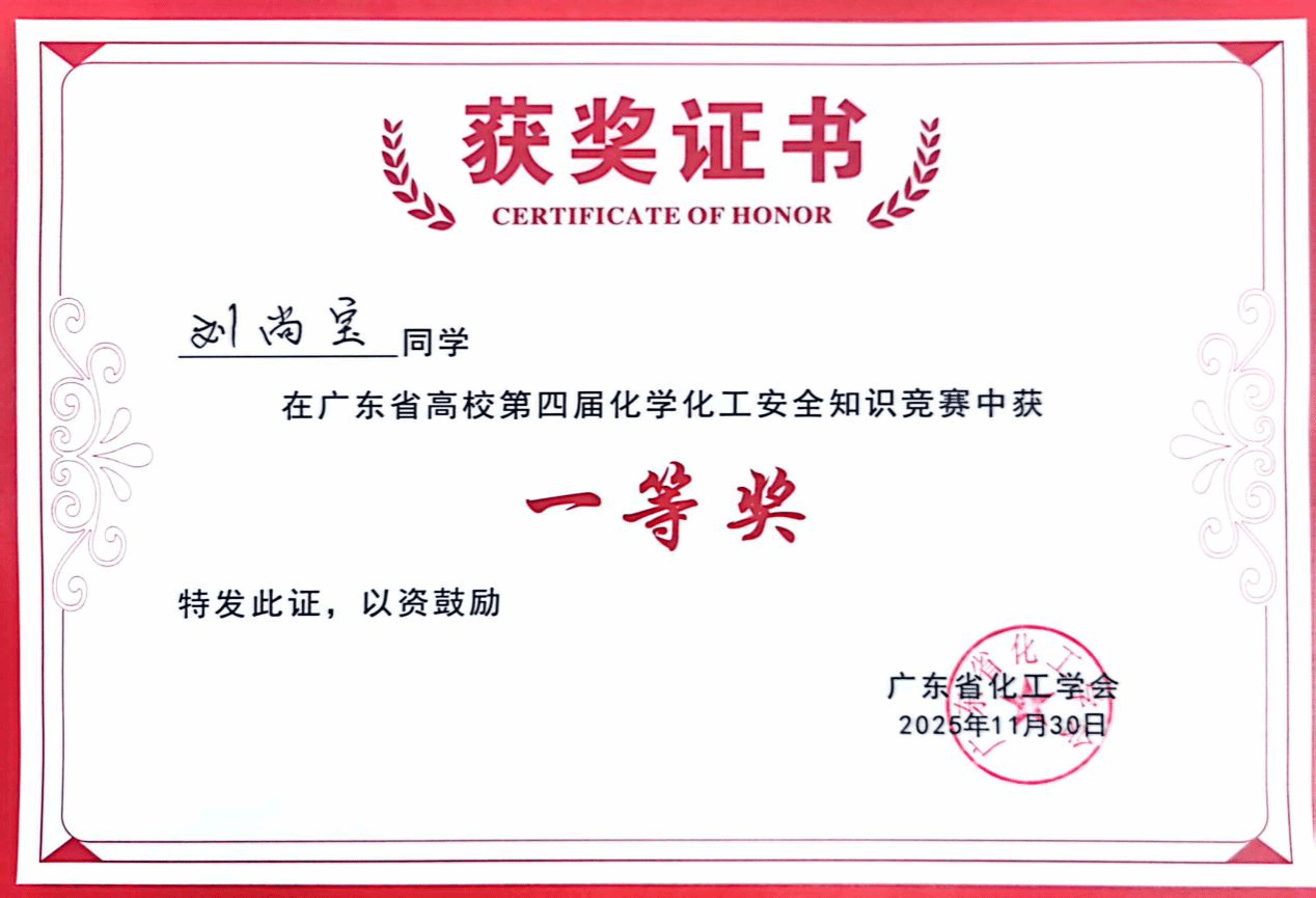 期间,在广东省高校第四届化学化工安全知识竞赛中,我院由刘尚宝、崔静、李炜等同学代表参赛,经过初赛和复赛的激烈角逐,最终获得一等奖1项,二等奖1项,三等奖1项,取得优异成绩。