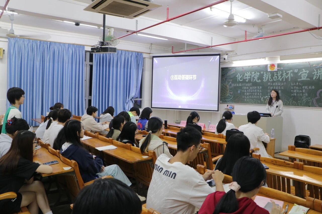 会上,学院创新创业部门成员通过视频向与会同学介绍“挑战杯”赛事背景、宗旨目标,系统展示该项课外学术科技作品竞赛的整体框架。随后,翁诗婷详细讲解“大挑”(全国大学生课外学术科技作品竞赛)与“小挑”(中国大学生创业计划竞赛)区别,并针对赛事流程、注意事项及我院历年获奖情况进行介绍说明。她从学生发展角度阐述参与“挑战杯”对提升个人综合素质的积极意义,包括丰富个人简历、锻炼沟通协作能力、培养创新思维及在评优评先中的竞争优势等。陈婕琳结合自身参赛经历,梳理讲述“挑战杯”赛事脉络、化学类与英语类相关赛事参赛经验,使同学们对竞赛过程有更具体直观认识。她鼓励在场同学积极把握机会、勇于挑战自我,以创新实践书写青春篇章。随后张乔博作简要总结,进一步提醒参赛路径与备赛方向。在互动答疑环节,同学们踊跃提问,嘉宾逐一给予细致解答,为同学们扫清备赛疑惑。