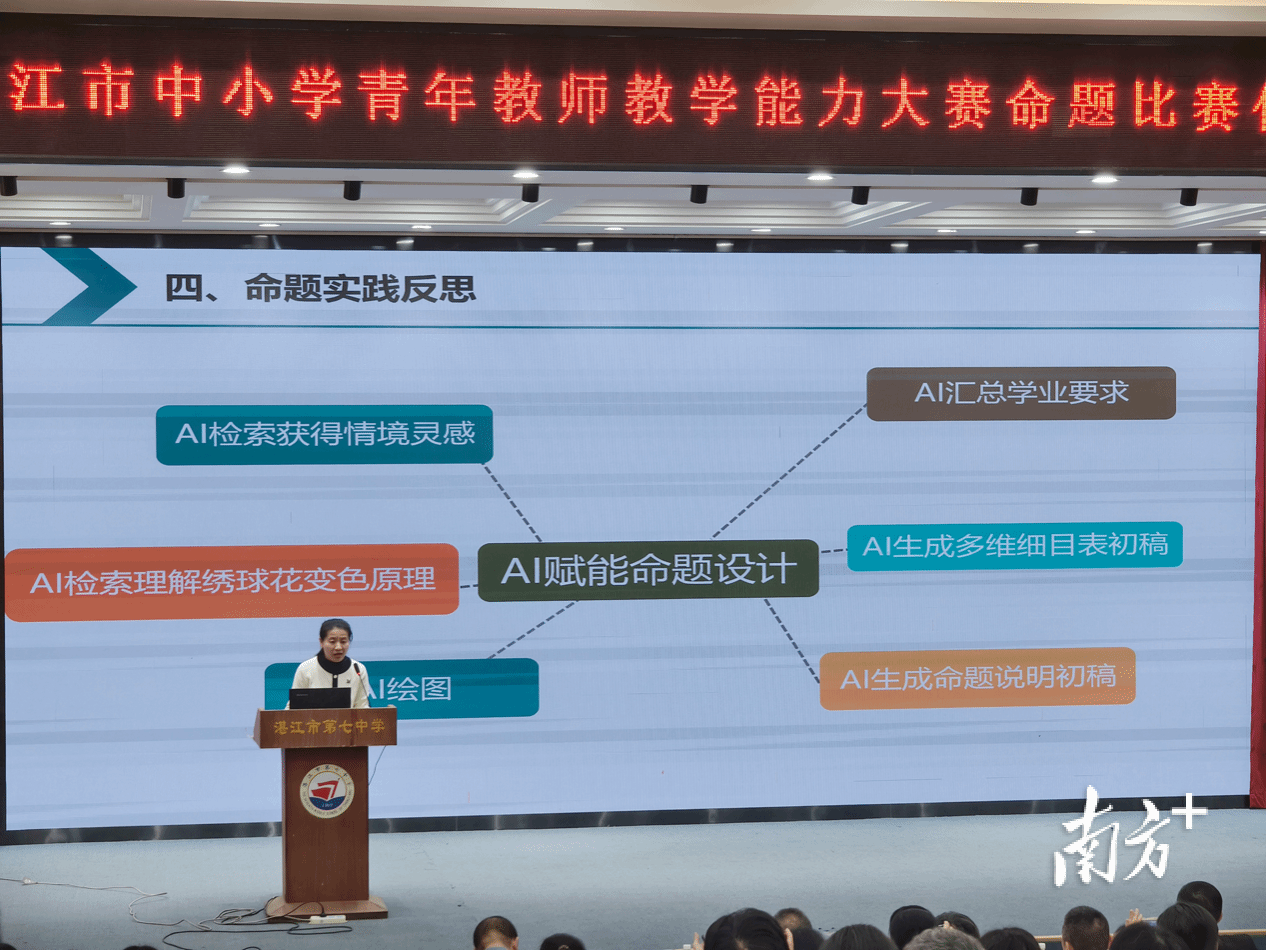 命题展示环节中,湛江市寸金培才学校叶玉纯老师代表初中组进行分享。她介绍,其团队试题设计着力推动从经验范式向科学范式、从知识立意向素养立意的转型,以学业要求为具体抓手,使核心素养的实现路径变得“可观察、可教学、可学习、可评价”。试题注重情境创设,如“无废城市”体现政策引领,“破碱成蝶”呈现知识结构化,“古法制硝”融合传统文化,“绣球花变色”贴近学生生活,“狮子洋大桥”绿色炼铁工艺则传递了环保理念与地域特色。团队还借助人工智能技术辅助素材检索、学业要求梳理及多维细目表生成,实现对命题质量的动态监测与科学优化,推动试题达到素养立意、情境真实、科学规范与价值浸润的有机统一。