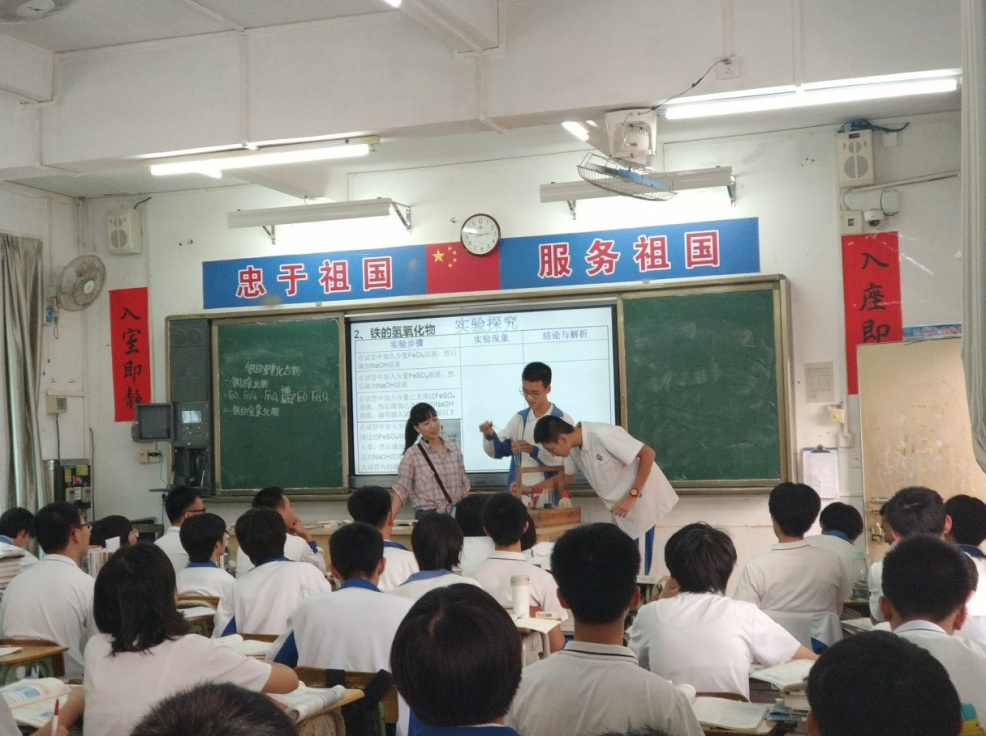 我院领导老师与全体实习生们观摩了实习生张晓微在高一(3)班的一节新课《铁的重要化合物》。本节以实验探究为取向的化学课堂,整个授课过程紧密结合化学学科特点,同学们积极参与到实验探究中,授课实习生借助实物投影仪让全班学生观看到演示实验的现象,让同学们从实验情境中学习铁的几种化合物的相关知识。